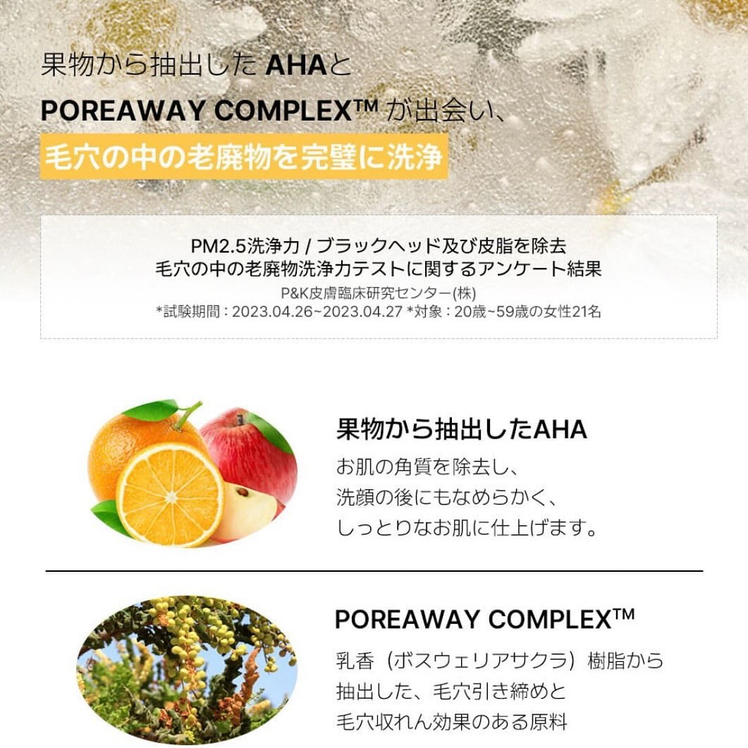 天然由来のビーガン成分:AHA、POREAWAYコンプレックス、ゴールデンホホバシードオイル、天然界面活性剤を含み、肌を柔らかくしっとり保ってくれる。 オイルが入っているのに、優しいまろやかな泡になるのが不思議✨ しっかり毛穴の汚れも落としてくれるのに、つっぱり感がないところがお気に入り😉💓