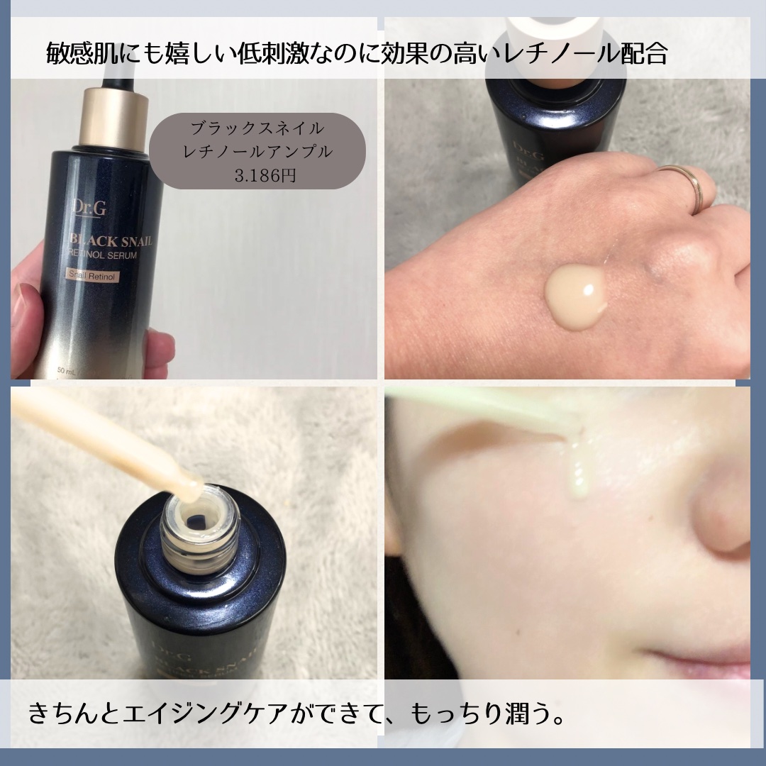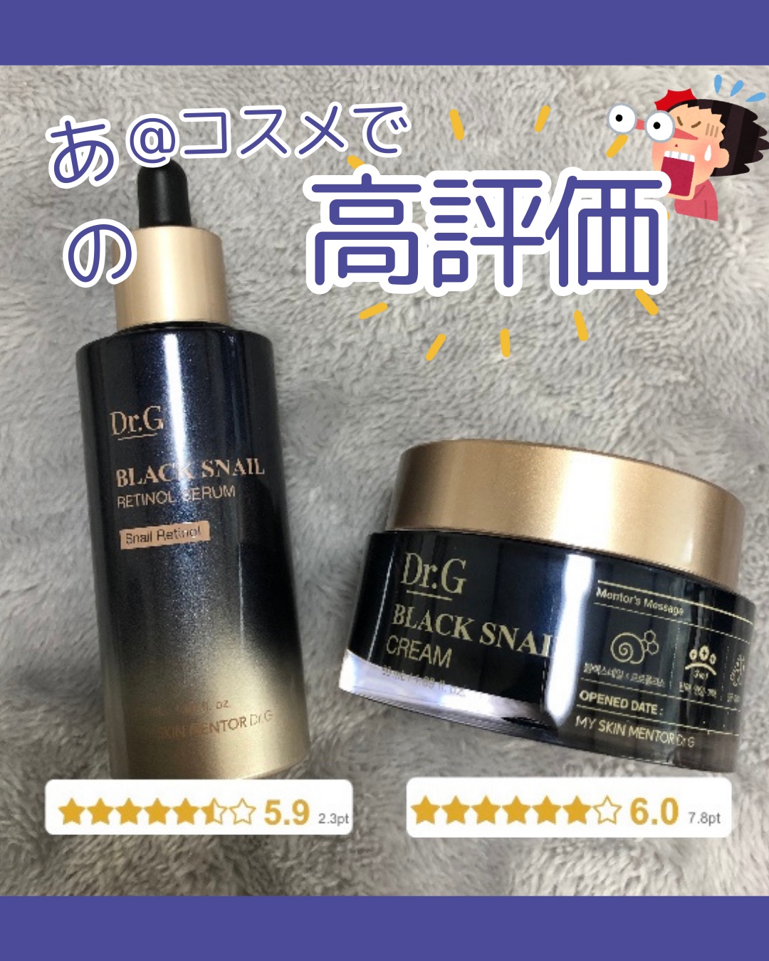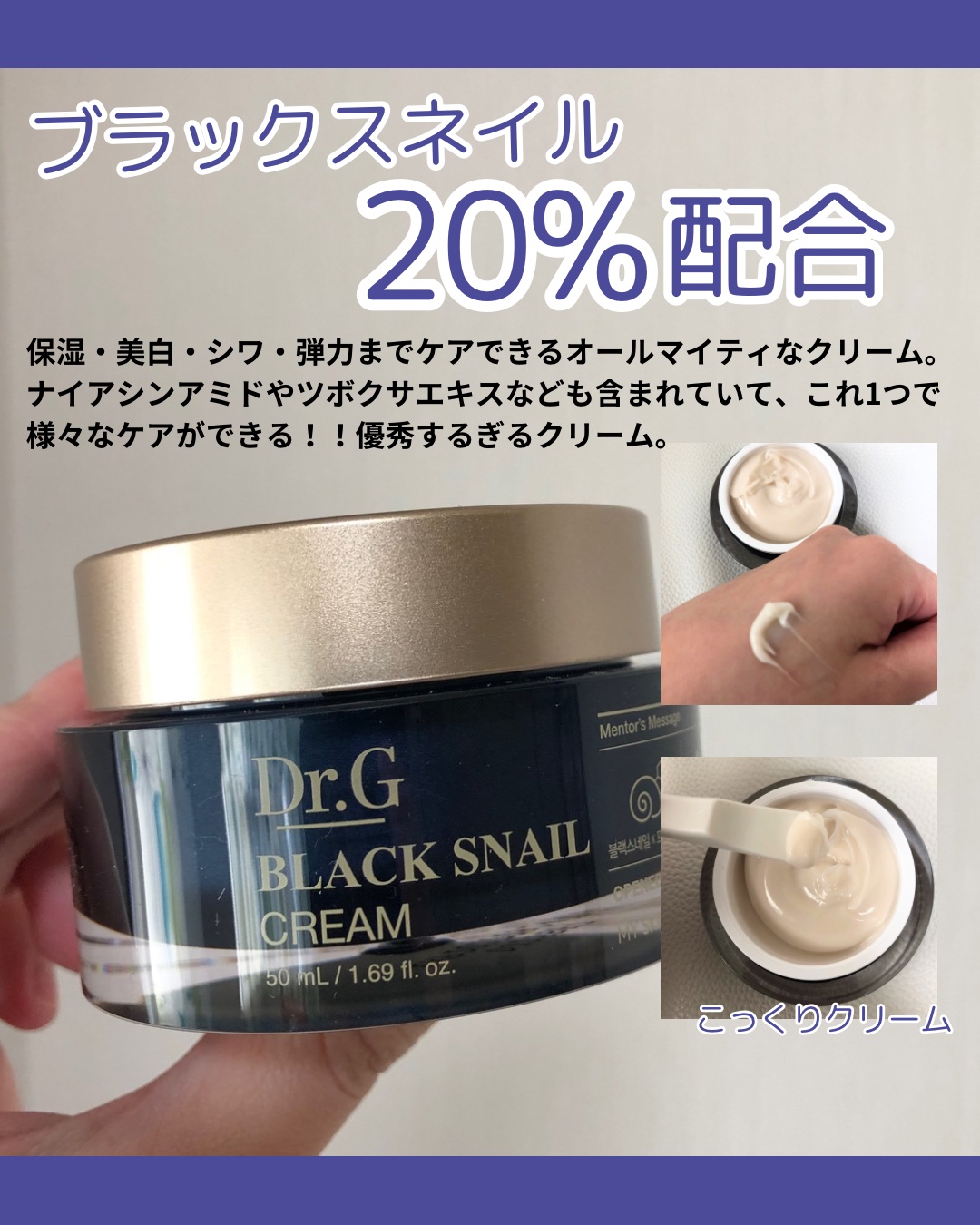 ブラックスネイルと低刺激のレチノールを配合した、マイナス6歳肌へと導く美容液。肌のハリ、毛穴、乾燥小じわ、くすみなど多方面に対してアプローチしてくれるDr.Gのエイジングケアラインです。 保湿だけではなく、美白、しわ、弾力のケアまで出来る高機能クリーム🤍 ブラックスネイル20%配合に加え、ブラックプロポリスやナイアシンアミド、ツボクサエキスも配合されている為、ひとつのクリームで様々なケアに対応し健やかな肌へと導きます。 もったりとしたテクスチャで、こっくりめのクリーム。塗った後の肌は皮膜感はあるのに嫌なベタつき等は全然感じません。