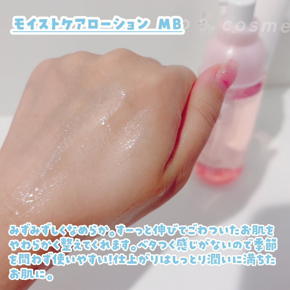 肌悩みに合わせて使えるスキンケアを使用しました🎵 かさつき・乾燥を防ぎしっとり美肌に導く化粧水と肌荒れの原因まで落とす薬用美容洗顔料です。 モイストケアローションMBはサラサラのテクスチャーです。伸びも良く、肌馴染みが良いです。ポンプ式のボトル🧴は衛生的に使えるのと、適量が出せるので好きです。 エッセンスインクレンジングフォームは少量で濃密な泡が簡単に出来ます。弾力のある泡で摩擦なく洗えます。洗い上りはしっとりで、つっぱりなどは感じませんでした。