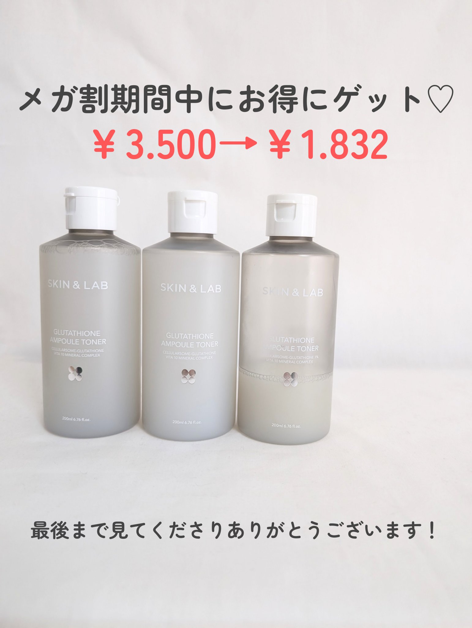 高純度のグルタチオンを配合したトナーで、明るい肌へと導いてくれるのだそう。 とろみのあるトナーなのですが、肌なじみがかなり良くて何度も重ねたくなるテクスチャー。 メガ割では20%オフで購入できます!ぜひチェックしてみてください🩶