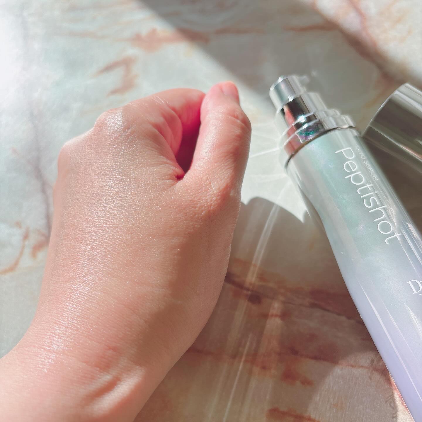 美容成分の入った”スピキュール”と”エクソソーム”を使った、弾力ケアが出来ちゃう美容液💓 3種類のバリエーション、①ビタミンショット ②ヒアルショット ③ペプチショット 純度100%のスピキュール🪡「ペプチエアロスピキュール™」ストロー状の形状で、スピキュールそのものにコーティングされている美容成分を届けてくれるそう🚚 シルバーのポンプ式の容器!パープルのグラデーションになってて、オシャレ💜 白く乳液みたいな柔らかめのテクスチャーで、香りは特に感じられません🐽