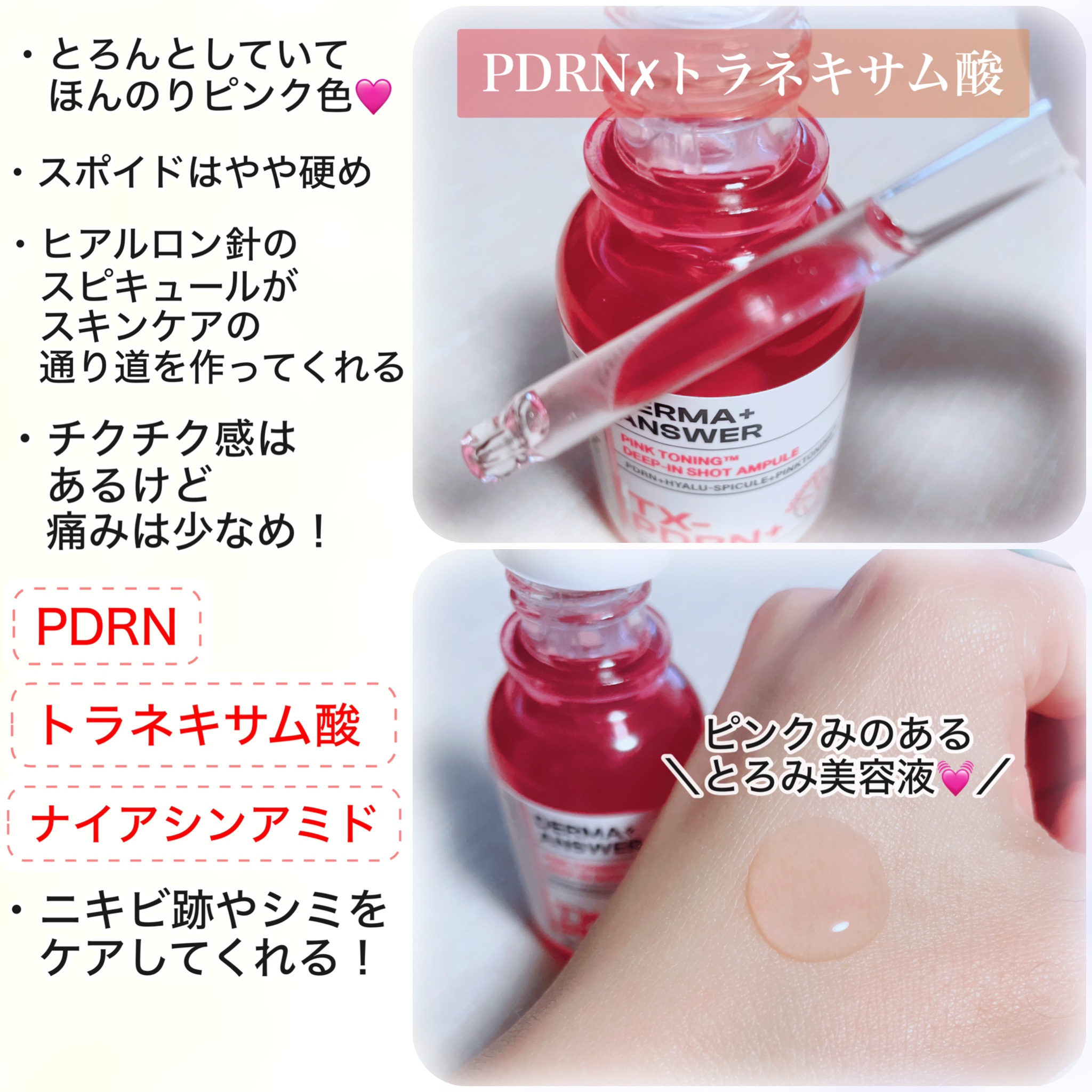 PDRN+トラネキサム酸の美白特化成分組み合わせで、くすんだ毛穴を明るく照らしてくれるピンクライト針美容液🪡 少しとろみがあるテクスチャーで塗り心地も◎ こちらの美容液はニキビ跡に効果があるとのこと! 保湿力もありますがベタつきが気にならないので朝も活躍しています☀️