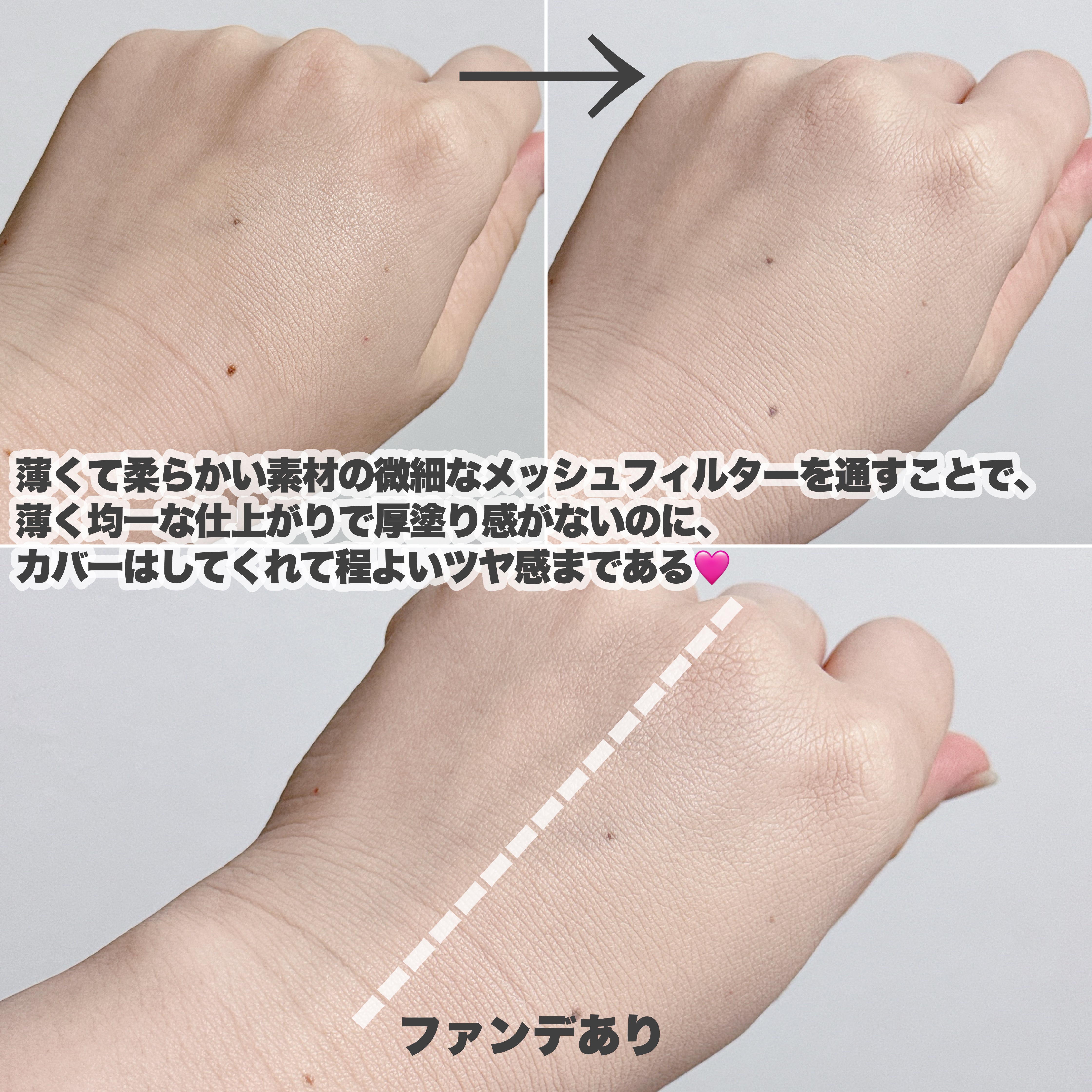 ファンデーションなのに、スキンケア効果もある人気の、エステパックファンデーションのソフトメッシュタイプです。 薄く均一な厚塗り感が無い仕上がりになります。 密着力がよく、ナチュラルなのに、しっかりカバーされて夕方の毛穴落ちも無く、軽い付け心地がよかったです。
