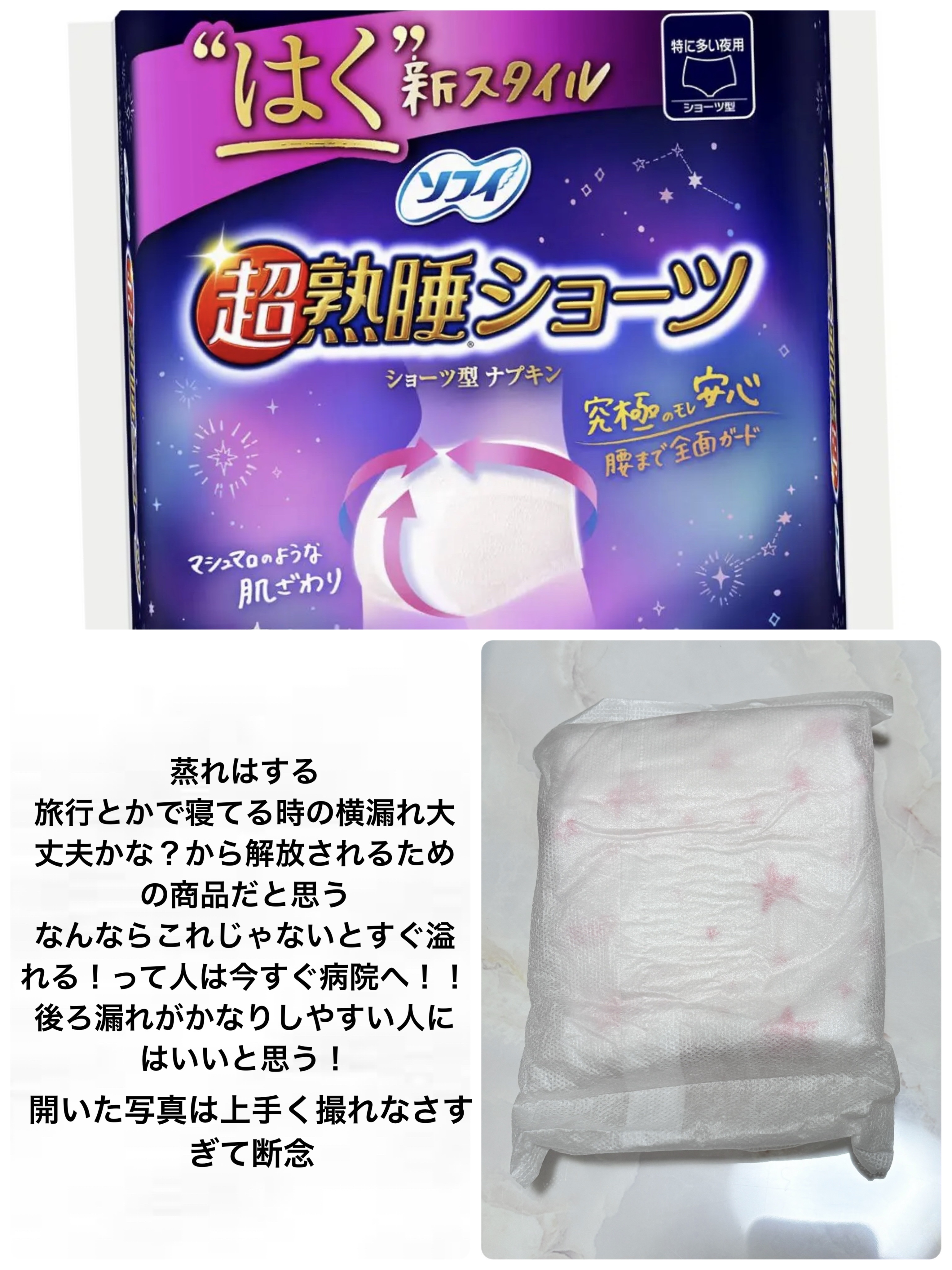 こんにちは!こげたぱんです🍞今回の投稿は、最近の生理で、生理用ショーツ(オムツ型?)を初めて使ってみたのでその記録です。★使用アイテム★★✨ユニ・チャーム超熟睡ショーツ 2枚組購入価格:約200円★★実は、この全部ナプキン型(オムツみたいな形...