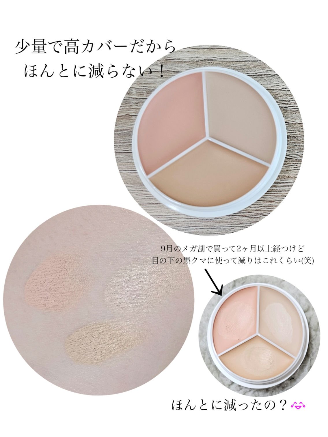 カバー力優秀優秀!! 他のパレットコンシーラーも良かったけど、 やっぱり人気なだけあってカバー力もあるよ!! 9色入ってるからあらゆるお悩みに対応できます! 3300円は高いよーーー。 でもね、ぐりはドンキで半額で買いました♡♡ なんか、商品入れ替えの為に半額になってたの!!