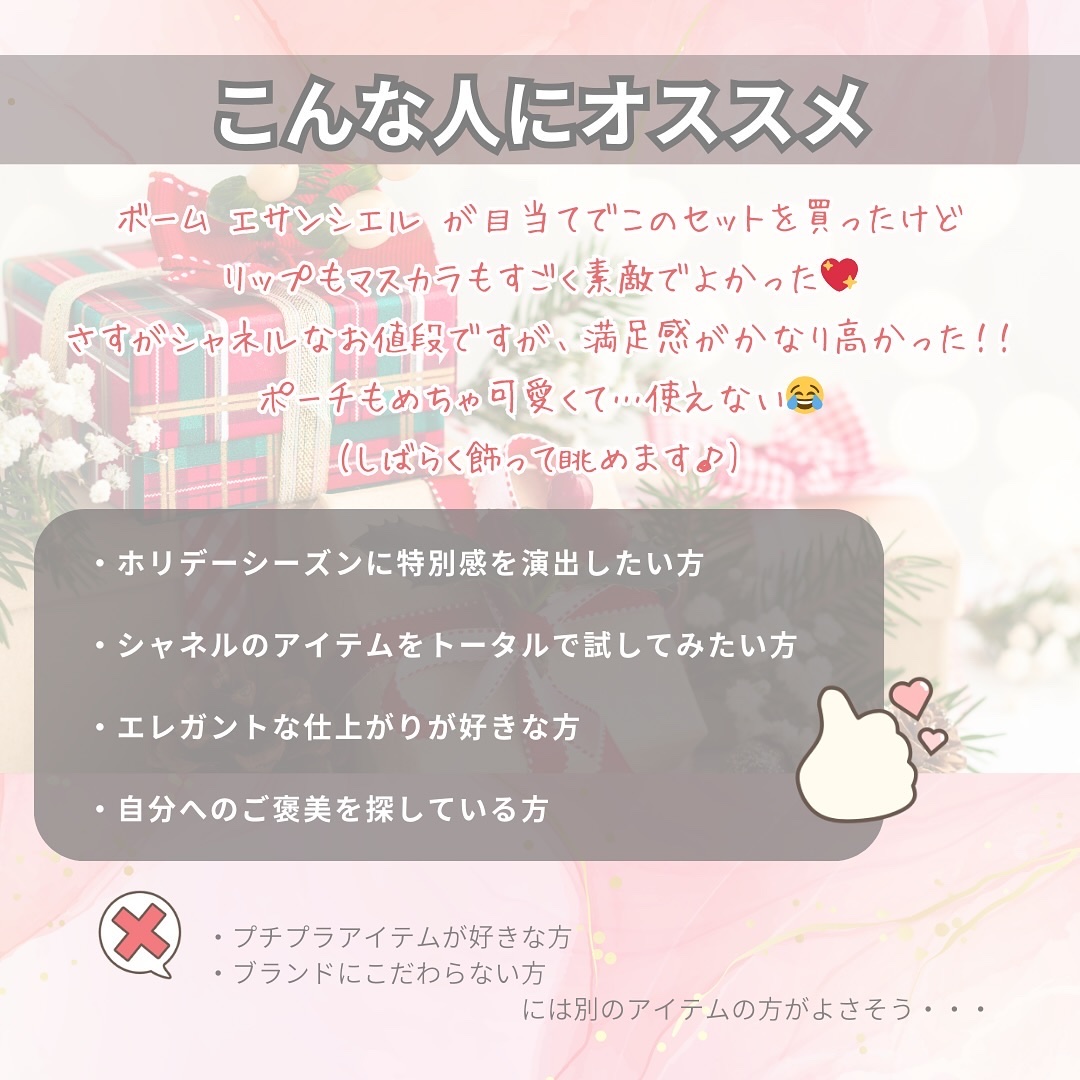 こんばんは🌙あやかです今回はCHANELのクリスマスコフレを紹介したよ💕CHANELって持ち歩くだけで自信持てる魔法のお守りみたいなブランドだなっていつも思ってます🥹かわいすぎるお得なポーチセットとクリスマスコフレぜひチェックしてみてね✊後で...