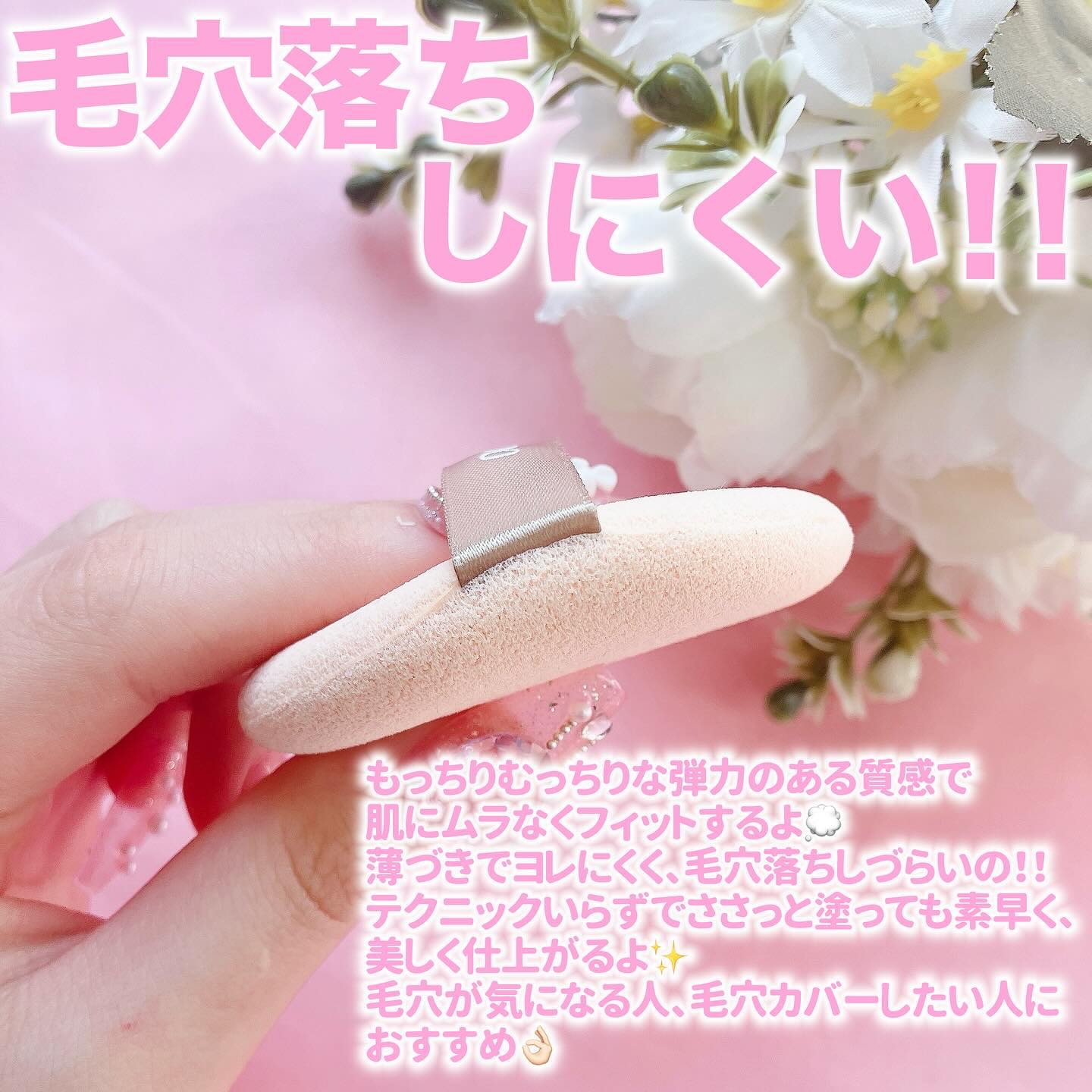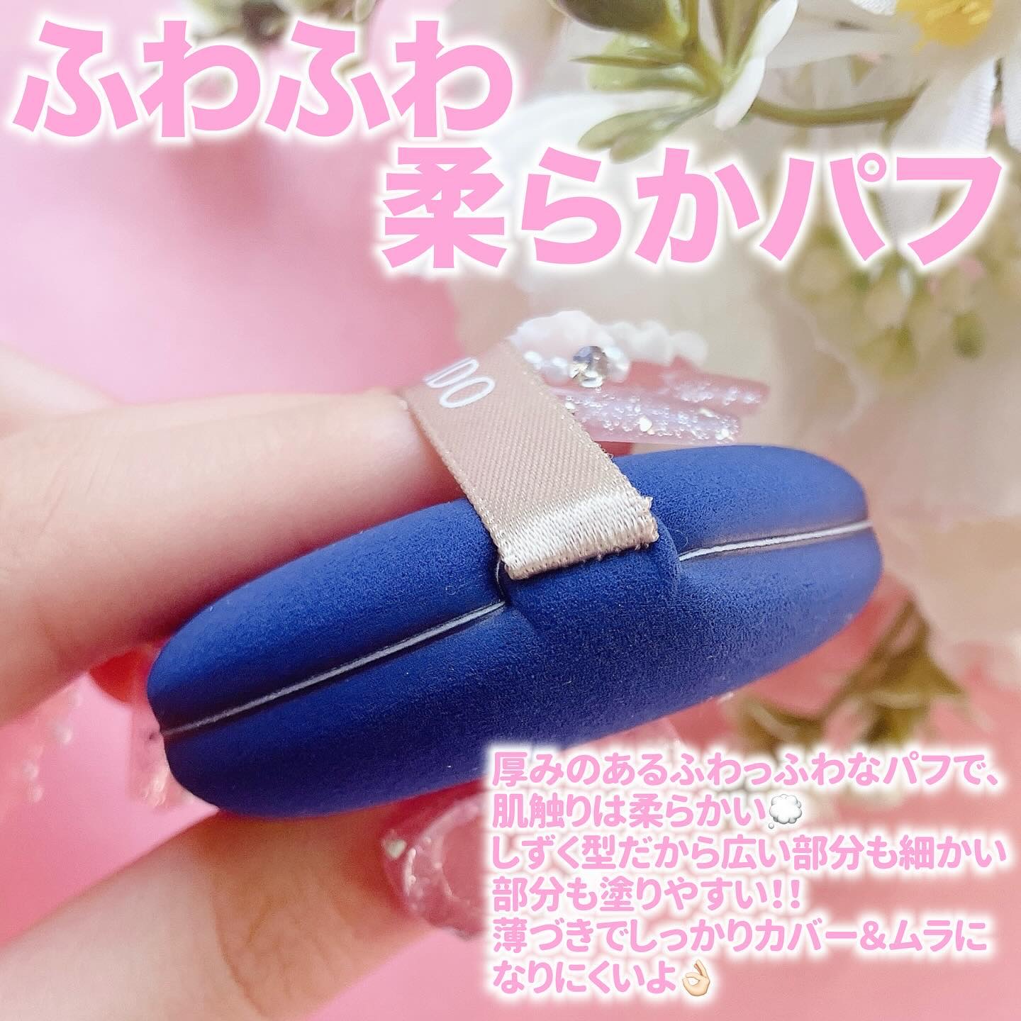 全ファンデーション対応で、どんなファンデもフィットするパフです✨ しっかり厚みのあるふわもちパフが、薄づきでしっかりカバーしてくれてムラにもなりにくかったです🥰 毛穴レスな陶器肌を実現してくれるパフです🌟 もちもちむちむちな弾力のあるパフが、肌にムラなくフィットしてくれます💓 薄づきなのにふわっと毛穴をぼかしてくれてヨレにくいように感じました🥰