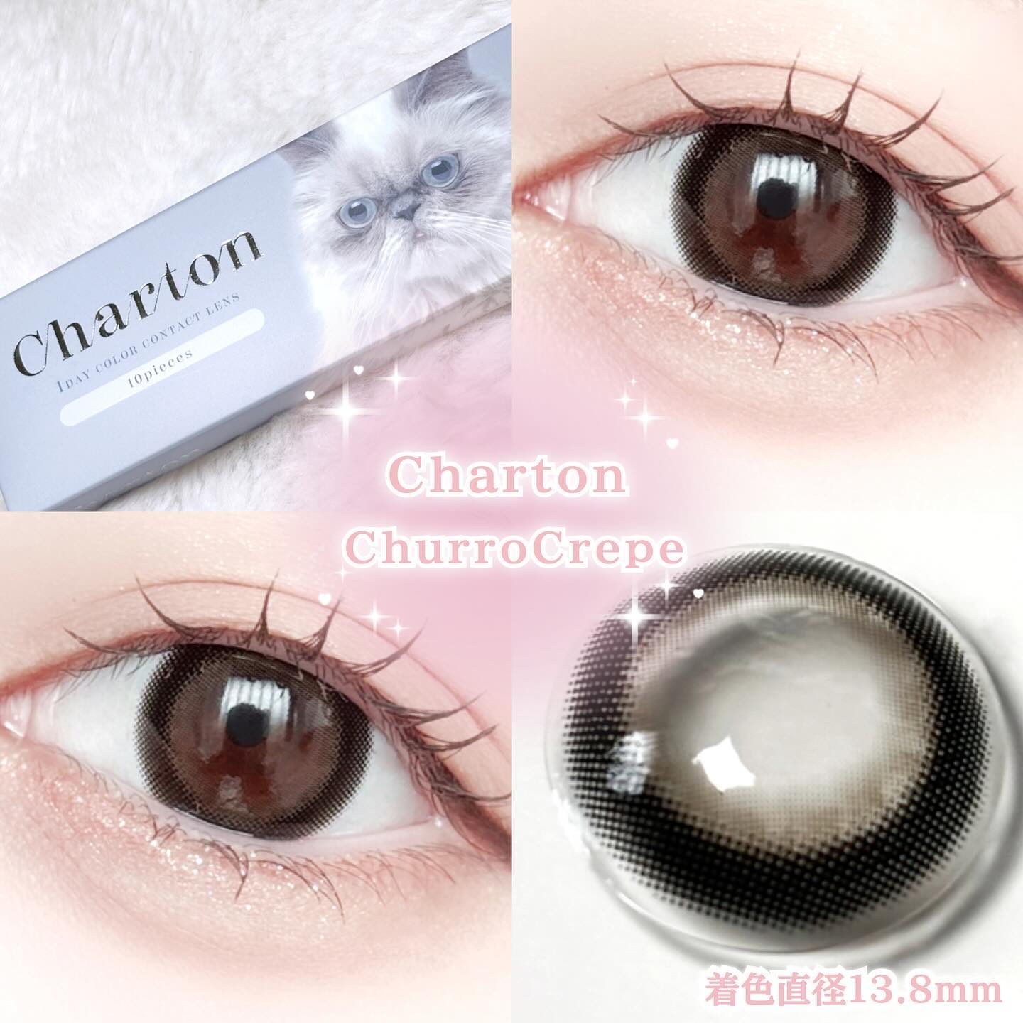 - Chaton【子猫】×Charm【魅力】 自分史上最強に可愛くいられる麗しくも可愛らしい女の子をイメージしたブランド <アイスミュール> 色素薄め透け感ブルー <コーヒーブラウニー> 細ふち大人っぽちゅるん <チュロクレープ> 太ふち×ミルクグレージュ <ビスケットスモア> 抜け感くすみベージュ <フィグコンポート> 色気漂うダークフィグ カラーコンタクトレンズの不適正使用による眼障害の危険性等などがあります。 ●コンタクトレンズは高度管理医療機器です。不十分な洗浄・消毒など不適切なケアや、長時間・交換期間を超えた装用により、アレルギー性結膜炎、角膜感染症、角膜潰瘍等の重篤な眼障害が発生する危険性があります ●ご使用前に取扱説明書を確認してください 使用上の留意事項 ●眼科医院等を受診してからお求めください ●眼に異常を感じたら直ちにレンズ使用を中止し、お近くの眼科等で診察を受けてください ●医師の指示にしたがってご使用ください ●コンタクトレンズを装用する場合、自覚症状がなくても、眼科医院等での定期検査を受けてください ●レンズに不具合がある場合は使用しないでください