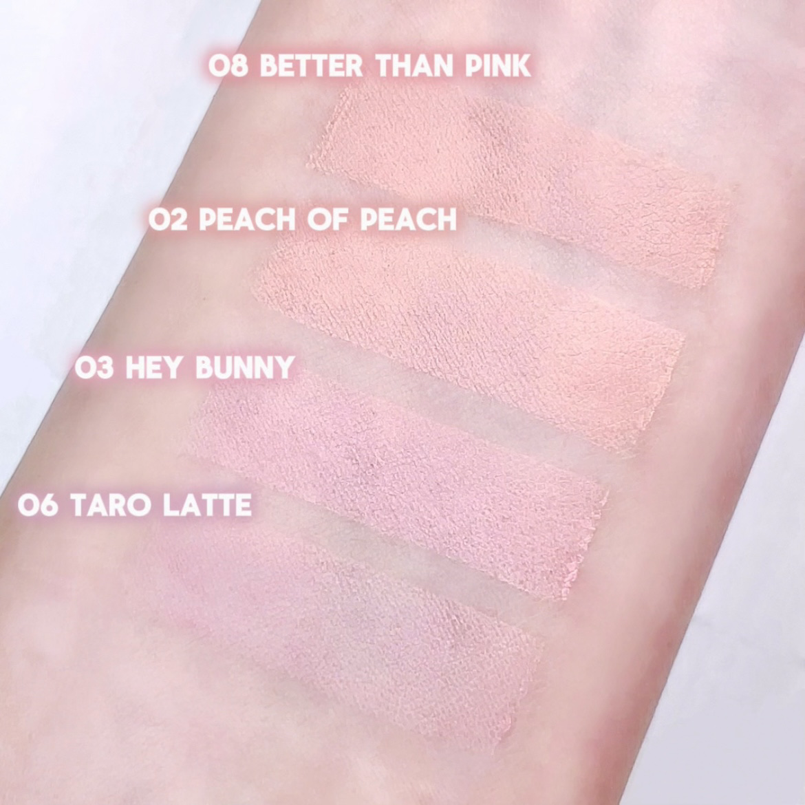- <01 キューティーパイ(Cutie Pie)> カオリン、ジメチコン、ポリプロピルシルセスキオキサン、フェニルトリメチコン、トリイソステアリン酸ポリグリセリル-2、(ビニルジメチコン/メチコンシルセスキオキサン)クロスポリマー、(HDI/トリメチロールヘキシルラクトン)クロスポリマー、合成ワックス、(VP/ヘキサデセン)コポリマー、マイクロクリスタリンワックス、合成ミツロウ、リンゴ酸ジイソステアリル、ポリリシノレイン酸ポリグリセリル-6、ジメチコンクロスポリマー、メタクリル酸メチルクロスポリマー、ラウリルポリグリセリル-3ポリジメチルシロキシエチルジメチコン、1,2-ヘキサンジオール、(エチレン/プロピレン)コポリマー、酢酸トコフェロール、カプリリルグリコール、シリカ、エチルヘキシルグリセリン、トコフェロール、酸化チタン、酸化鉄、赤202、黄5 <02 ピーチオブピーチ(Peach of Peach)> カオリン、ジメチコン、ポリプロピルシルセスキオキサン、フェニルトリメチコン、(ビニルジメチコン/メチコンシルセスキオキサン)クロスポリマー、トリイソステアリン酸 ポリグリセリル-2、(HDI/トリメチロールヘキシルラクトン)クロスポリマー、合成ワッ クス、(VP/ヘキサデセン)コポリマー、マイクロクリスタリンワックス、合成ミツロウ、ポリリシノレイン酸ポリグリセリル-6、ジメチコンクロスポリマー、リンゴ酸ジイソステアリル、メタクリル酸メチルクロスポリマー、ラウリルポリグリセリル-3ポリジメチルシロキシエチルジメチコン、1,2-ヘキサンジオール、(エチレン/プロピレン)コポリマー、酢酸 トコフェロール、カプリリルグリコール、シリカ、エチルヘキシルグリセリン、トコフェロール、酸化チタン、酸化鉄、赤201、黄5、赤202 <03 ヘイバニー(Hey Bunny)> カオリン、ジメチコン、ポリプロピルシルセスキオキサン、フェニルトリメチコン、(ビニルジメチコン/メチコンシルセスキオキサン)クロスポリマー、トリイソステアリン酸ポリグリセリル-2、(HDI/トリメチロールヘキシルラクトン)クロスポリマー、合成ワックス、(VP/ヘキサデセン)コポリマー、マイクロクリスタリンワックス、合成ミツロウ、ポ リリシノレイン酸ポリグリセリル-6、ジメチコンクロスポリマー、リンゴ酸ジイソステアリル、メタクリル酸メチルクロスポリマー、ラウリルポリグリセリル-3ポリジメチルシロキシエチルジメチコン、1,2-ヘキサンジオール、(エチレン/プロピレン)コポリマー、酢酸トコフェロール、カプリリルグリコール、シリカ、エチルヘキシルグリセリン、トコフェロール、酸化チタン、酸化鉄、赤104(1)、黄4、青1 <04 ラブヤ(Love Ya)> カオリン、ジメチコン、ポリプロピルシルセスキオキサン、フェニルトリメチコン、(ビニルジメチコン/メチコンシルセスキオキサン)クロスポリマー、トリイソステアリン酸ポリグリセリル-2、(HDI/トリメチロールヘキシルラクトン)クロスポリマー、合成ワックス、(VP/ヘキサデセン)コポリマー、マイクロクリスタリンワックス、合成ミツロウ、ポリリシノレイン酸ポリグリセリル-6、リンゴ酸ジイソステアリル、ジメチコンクロスポリマー、メタクリル酸メチルクロスポリマー、ラウリルポリグリセリル-3ポリジメチルシロキシエチルジメチコン、1,2-ヘキサンジオール、(エチレン/プロピレン)コポリマー、酢酸トコフェロール、カプリリルグリコール、シリカ、エチルヘキシルグリセリン、トコフェロール、酸化チタン、赤104(1)、酸化鉄、青1 <05 プリティークール(Pretty Cool)> カオリン、ジメチコン、ポリプロピルシルセスキオキサン、フェニルトリメチコン、トリイソステアリン酸ポリグリセリル-2、(ビニルジメチコン/メチコンシルセスキオキサン)クロスポリマー、(HDI/トリメチロールヘキシルラクトン)クロスポリマー、合成ワックス、(VP/ヘキサデセン)コポリマー、マイクロクリスタリンワックス、リンゴ酸ジイソステアリル、合成ミツロウ、ポリリシノレイン酸ポリグリセリル-6、ジメチコンクロスポリマー、メタクリル酸メチルクロスポリマー、ラウリルポリグリセリル-3ポリジメチルシロキシエチルジメチコン、1,2-ヘキサンジオール、(エチレン/プロピレン)コポリマー、酢酸トコフェロール、カプリリルグリコール、シリカ、エチルヘキシルグリセリン、トコフェロール、酸化チタン、赤104(1)、黄4 <06 タロラテ(Taro Latte)> カオリン、ジメチコン、ポリプロピルシルセスキオキサン、フェニルトリメチコン、(ビニルジメチコン/メチコンシルセスキオキサン)クロスポリマー、トリイソステアリン酸ポリグリセリル-2、(HDI/トリメチロールヘキシルラクトン)クロスポリマー、合成ワックス、(VP/ヘキサデセン)コポリマー、マイクロクリスタリンワックス、合成ミツロウ、ポ リリシノレイン酸ポリグリセリル-6、ジメチコンクロスポリマー、リンゴ酸ジイソステアリ ル、メタクリル酸メチルクロスポリマー、ラウリルポリグリセリル-3ポリジメチルシロキシエチルジメチコン、1,2-ヘキサンジオール、(エ
