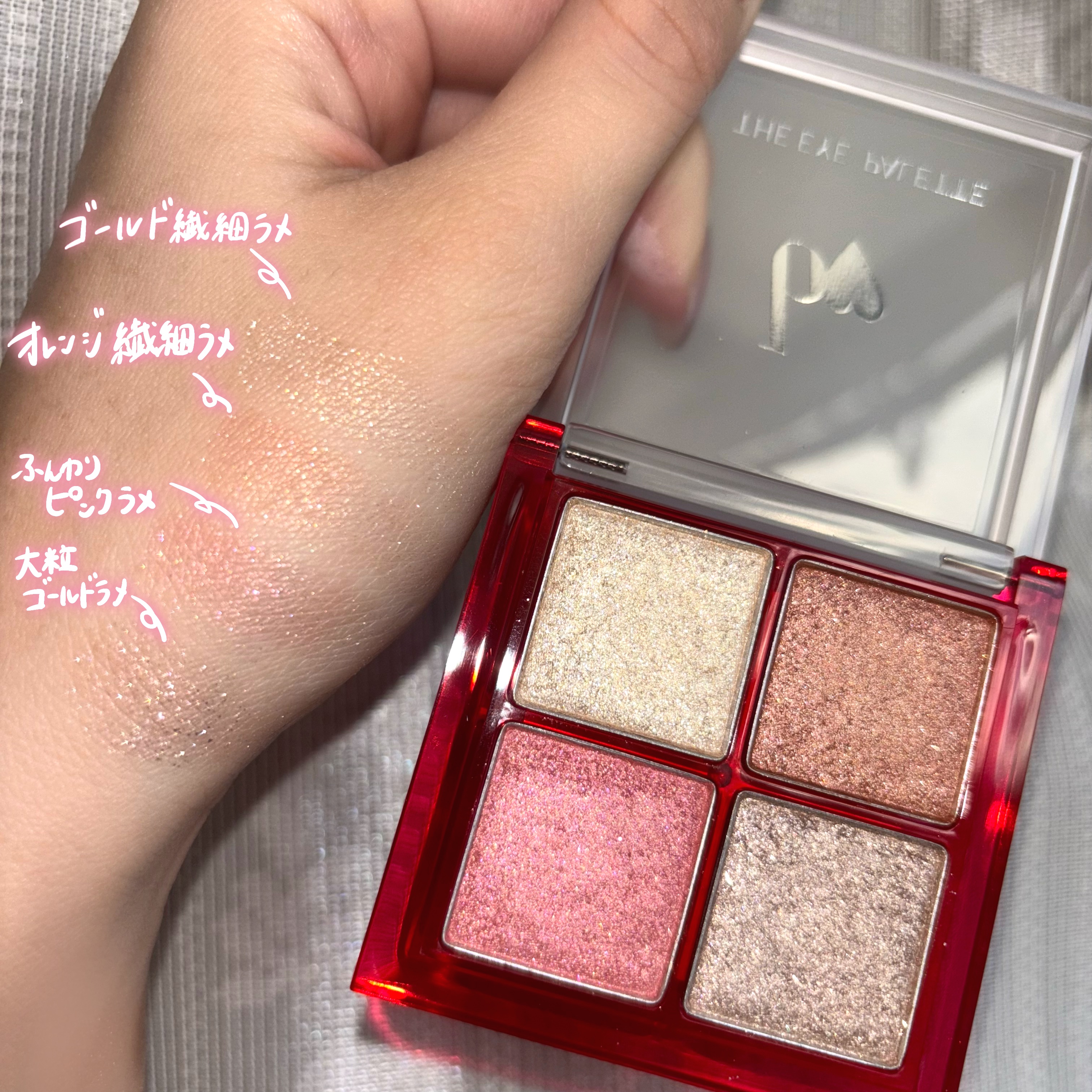 楽しみにしていた限定パレット! ケースも赤でクリスマスっぽくて可愛い🎄 全色ラメの豪華なパレット💎 ラメの色も大きさも光の強さも全部違います! 右上が割と発色するので一応これ1個でも使えます! 左下のピンクを涙袋に塗ったらとてもかわいかったです💖