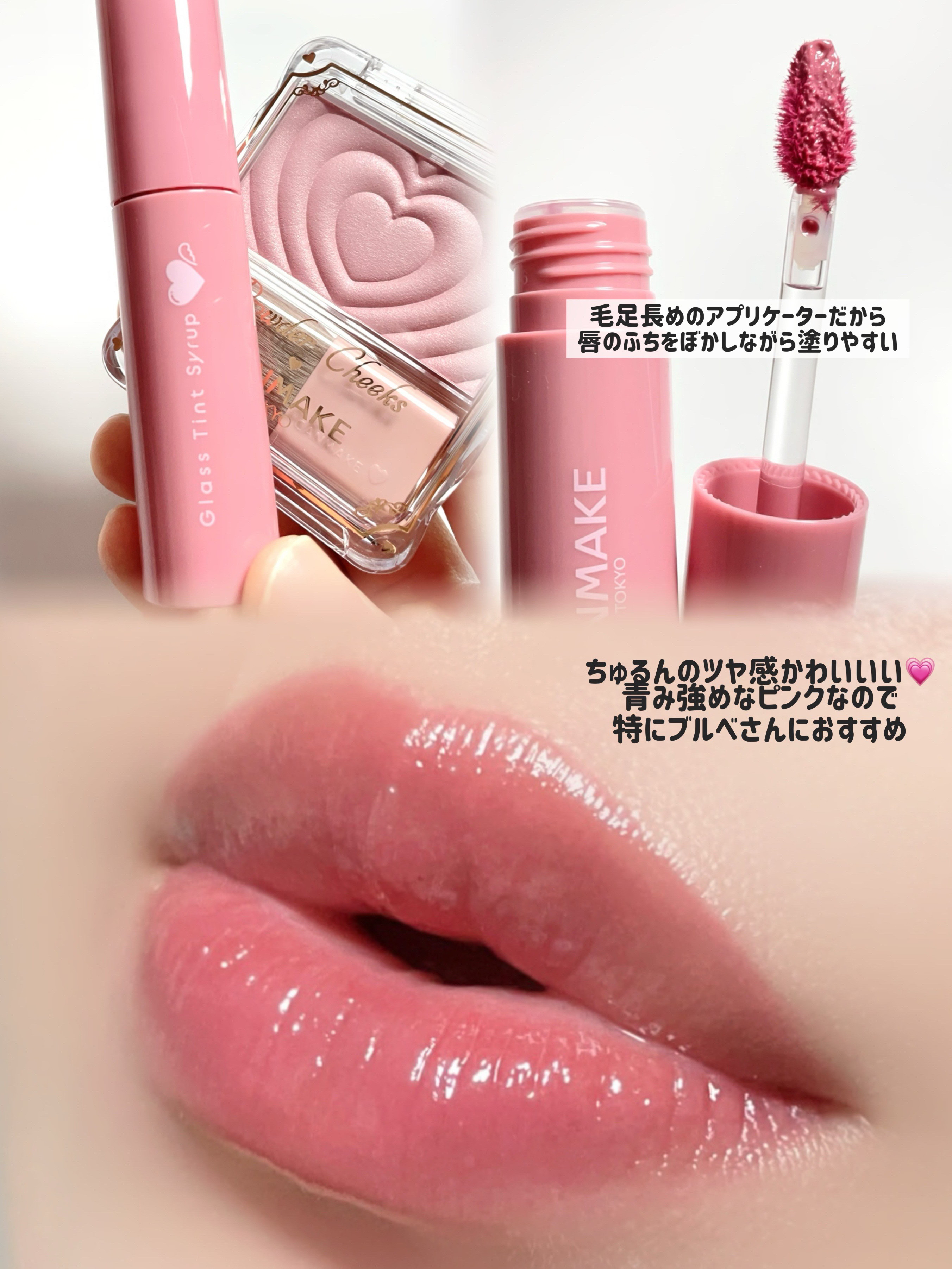 グラスティントシロップ04ブリスフルピンクはうさぎの舌のような明るめ青み粘膜ピンク🩷 パウダーチークスP05クラッシーモーヴピンクは上品さと可愛さをあわせ持つモーヴピンク🩷 透明感*メイクにピッタリ🫧 どちらも肌馴染みよく使いやすいよ!