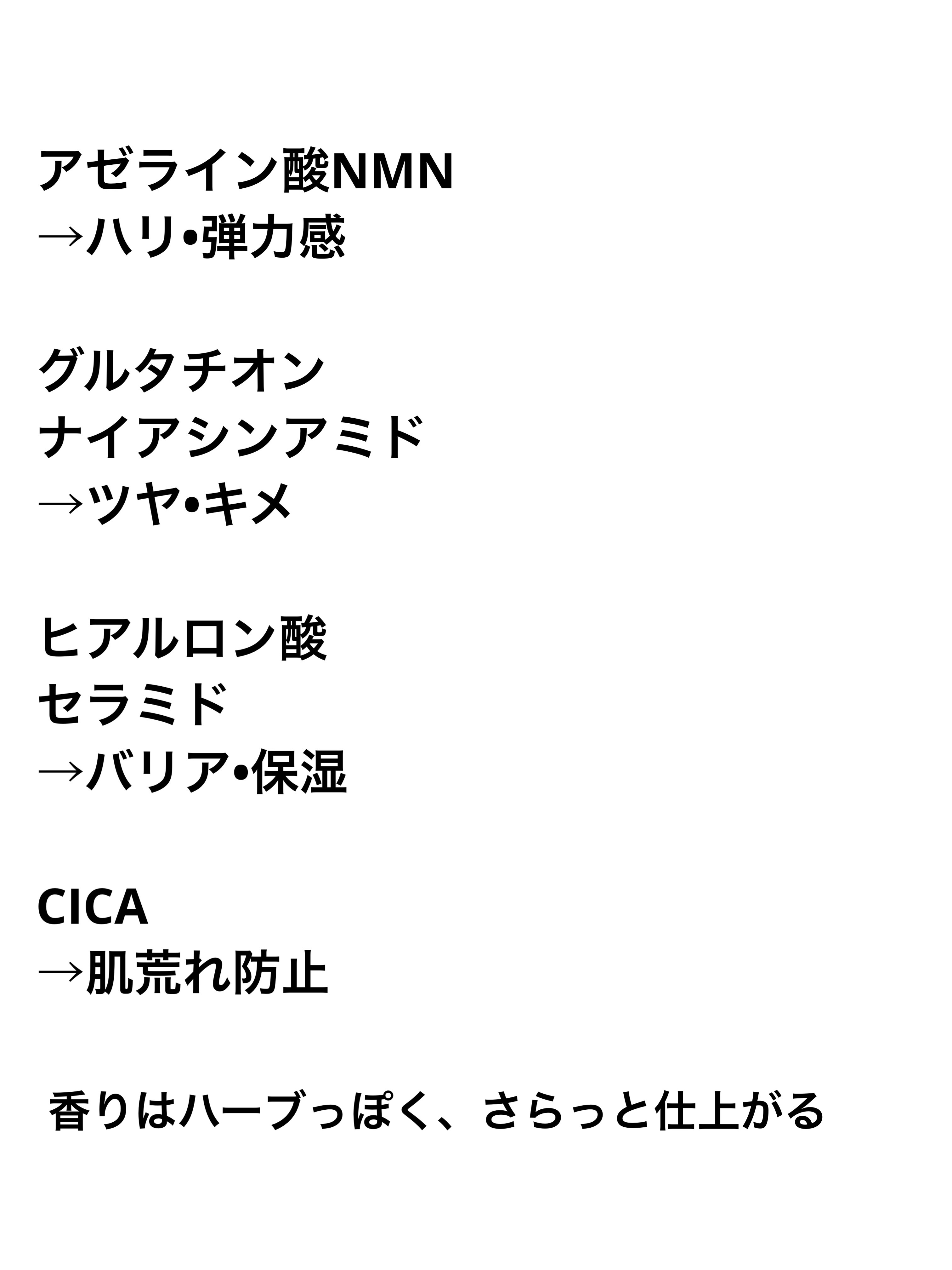 - <28mL> 水、グリセリン、DPG、アゼライン酸、ミネラルオイル、ジグリセリン、ニコチンアミドモノヌクレオチド、グルタチオン、ナイアシンアミド、ツボクサエキス、ヒアルロン酸Na、セラミドAP、セラミドNG、セラミドNP、セラミドEOP、スクワラン、水添レシチン、トコフェロール、ステアリン酸ポリグリセリル-2、ステアリン酸グリセリル、ステアリン酸グリセリル(SE)、フィトステロールズ、水酸化Na、ポリソルベート60、キサンタンガム、(アクリル酸ヒドロキシエチル/アクリロイルジメチルタウリンNa)コポリマー、ヒドロキシアセトフェノン、ベヘニルアルコール、ステアリルアルコール、フェノキシエタノール、香料