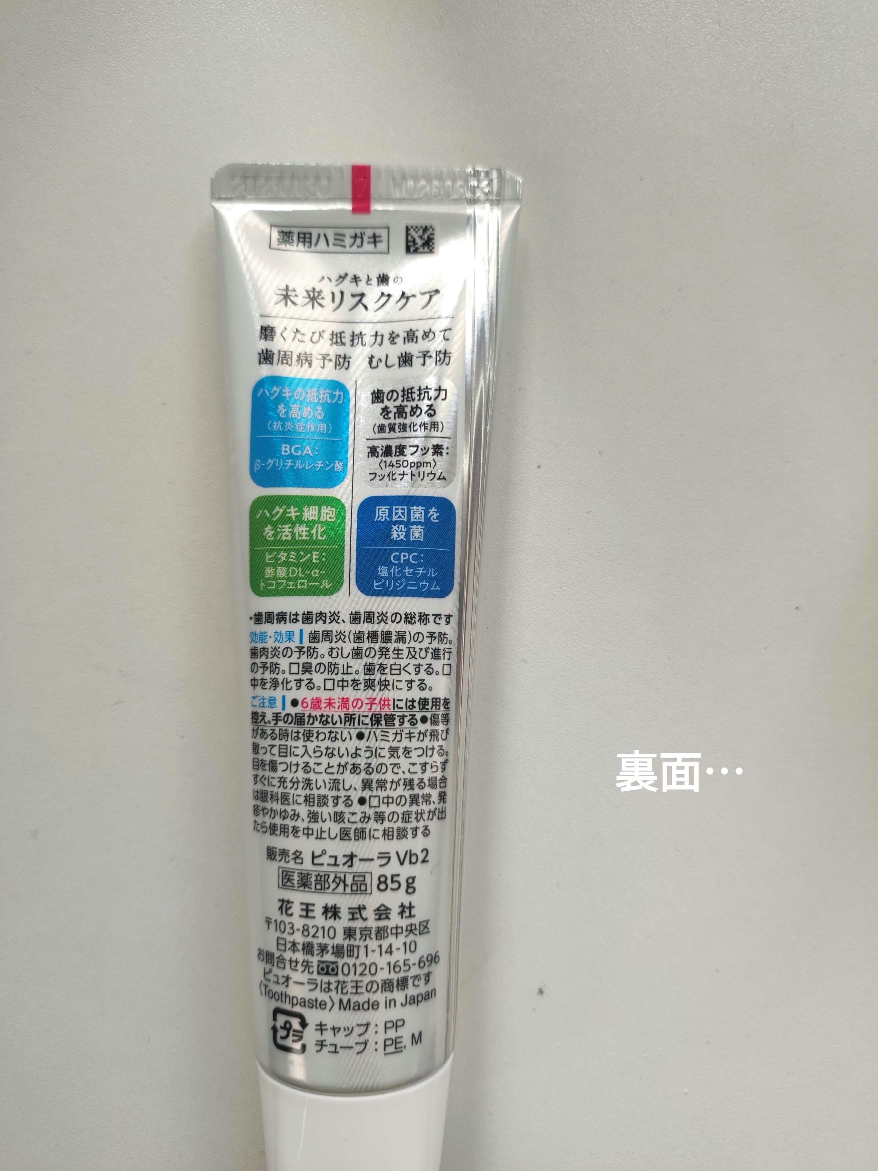 - 【医薬部外品】 ハグキと歯の未来リスクケア 磨くたび、歯周病(歯肉炎・歯周炎)・むし歯予防。 抗炎症成分BGA(β-グリチルレチン酸)が汚れや菌からハグキを防御して、歯周病予防。 ビタミンE(酢酸DL-α-トコフェロール)がハグキ細胞を活性化して、歯周病予防。 歯質強化成分の高濃度フッ素<1450ppm>が菌の出す酸から歯を防御して、むし歯予防。 殺菌成分CPC(塩化セチルピリジニウム)が原因菌を殺菌し、むし歯・口臭予防。 清浄剤エリスリトールが菌のかたまりを分散しやすくして、口中浄化。 ハミガキ粉内のゲルカプセルの働きによって、歯周ポケット(歯と歯ぐきの間)の奥深くまで薬用成分を届ける。 じっくり長磨きしやすいマルチケアペースト。 *6歳未満の子供には使用を控え、手の届かない所に保管する