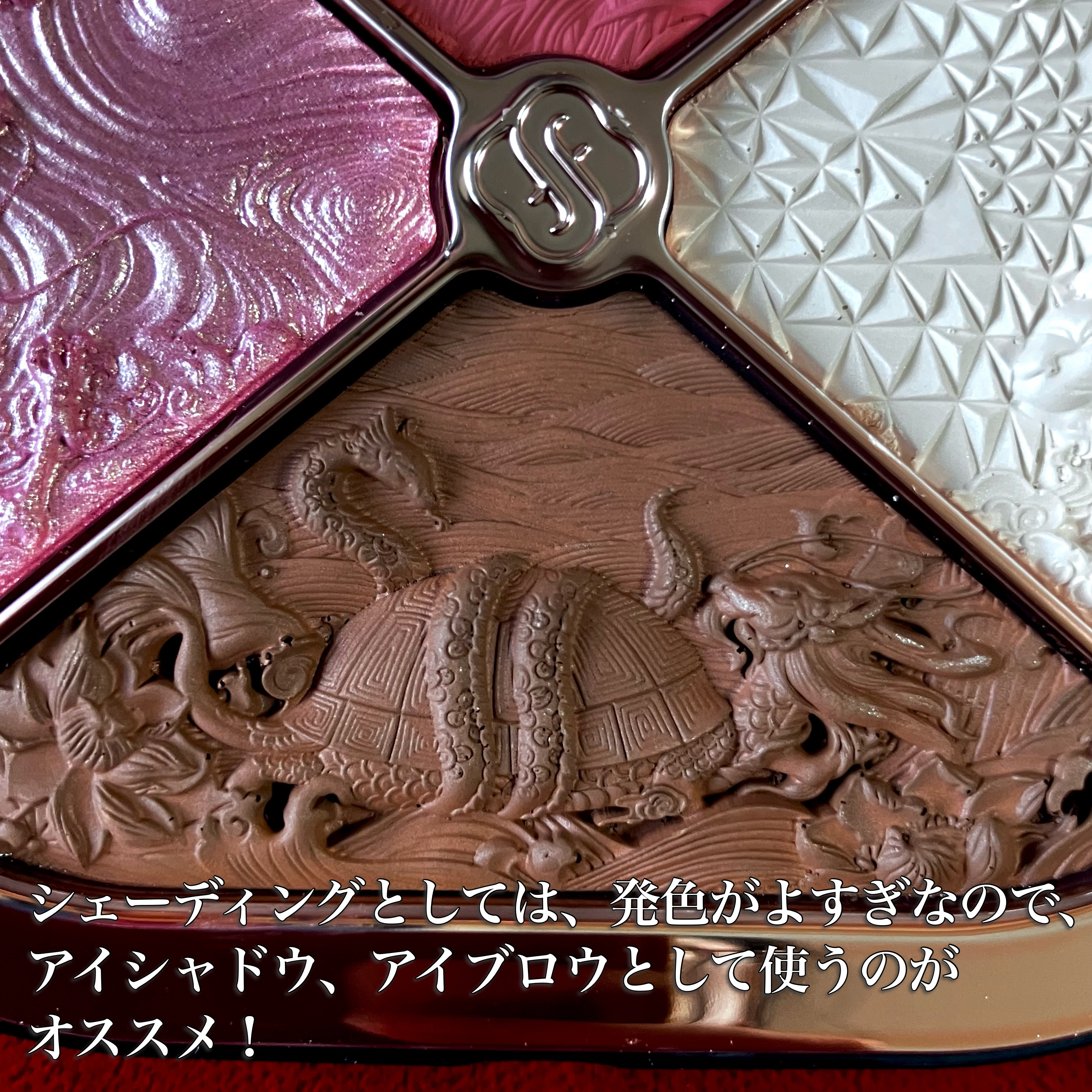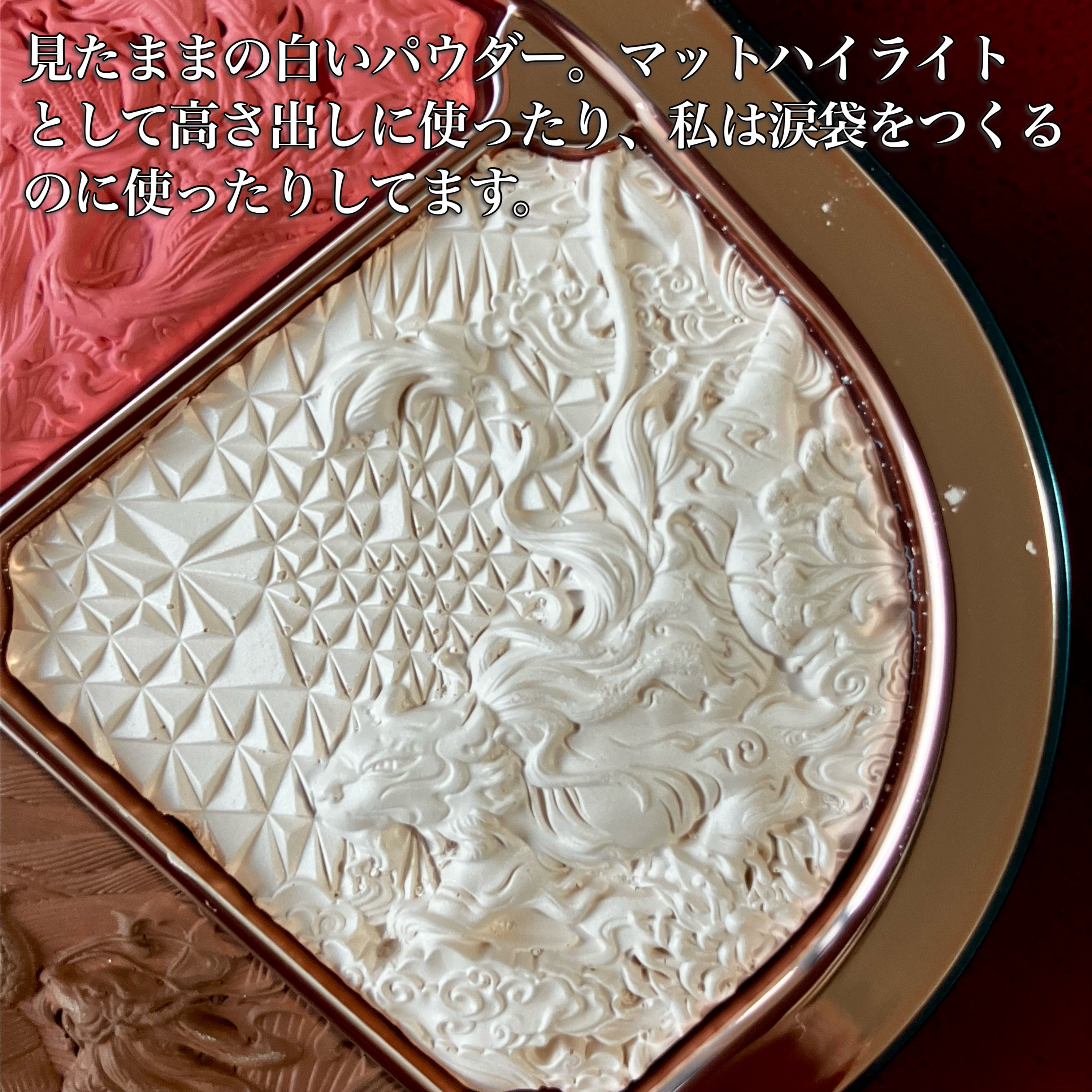 - ・中国伝統の彫刻技法を通じて、幸せと好運をもたらす四大霊獣(ヨンダイレイジュウ) 「青龍(セイリュウ)」「朱雀(スザク)」「白虎(ビャッコ)」「玄武(ゲンブ)」を日常のメイクパレットに再現。 ・日常で使いやすい4色入りで、アイシャドウ、ハイライト、シェーディングやチークとしても使え、パレット一つで、顔に立体感を引き出すことができる。 ・しっとりした質感が肌に馴染みやすく、ぼかしやすい。 ラメ&マット、二つの質感の粉質の組み合わせで、よりメイクを楽しめる。
