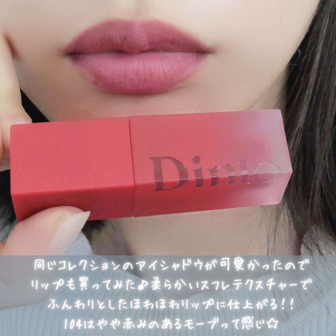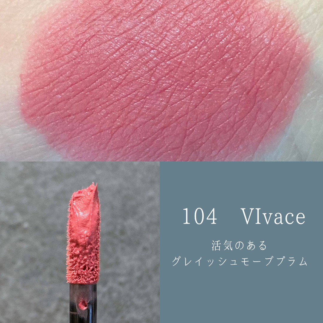薄く密着するスフレのようなテクスチャー。縦シワが目立って汚く見えるようなこともなく、加工したようなふわふわマットリップに仕上がります😆 104はグレイッシュモーヴプラム、105はシュガーピンクカラー。私の唇では104は公式画像よりもより鮮やかで赤み寄りに、105は公式画像よりも彩度が低く白みが強い色味に発色しました。 唇に染み込むような馴染み方をするので、唇だけが浮くことがないところが好きです❣️