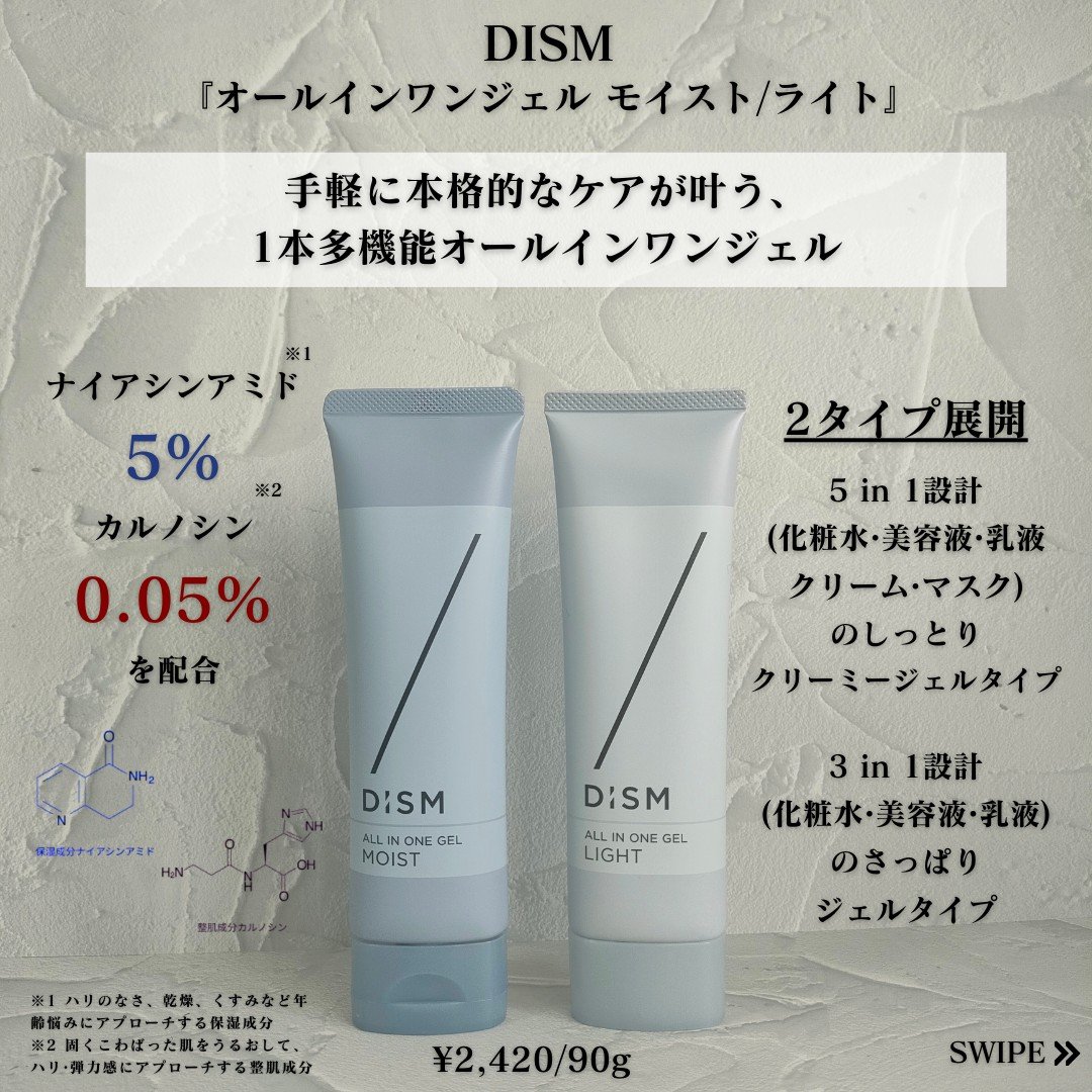 DISM「オールインワンジェル」肌タイプや季節に合わせてしっとり・さっぱり2タイプ♡1本で洗顔後のスキンケアが完結できちゃうよ!︎︎︎︎︎︎☑︎しっとりタイプ化粧水・美容液・乳液・クリーム・マスク5つの機能の5in1のクリーミージェルしっかり...