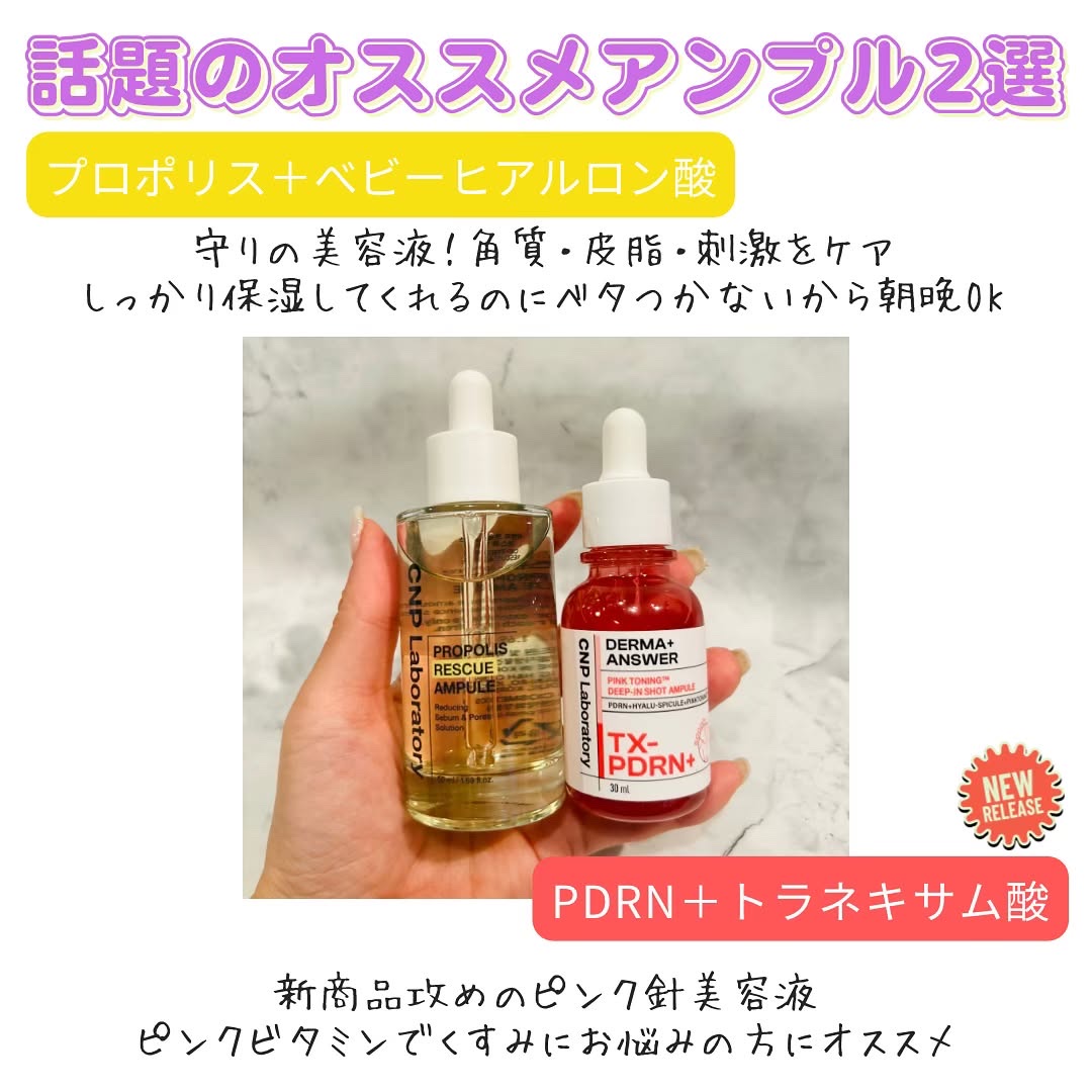 CNPプロポリスレスキューアンプルは済州産のプロポリスがお肌を鎮静してくれるセラム✨過剰な皮脂のコントロールや角質のケアもしてくれるから、ニキビやトラブル肌の方にぜひ使ってほしい😉 ダーマアンサーピンクトーニングディープインショットアンプルは発売されたばかりの針美容液✨お肌のくすみやニキビ後などをケアして明るいお肌にしてくれる✨ PDRN配合でお肌をふっくらとさせ、トラネキサム酸がニキビなどの跡をキレイにしてくれる✨私も針のチクチクはあまり得意じゃないけど、こちらは大丈夫でした🙆♀️