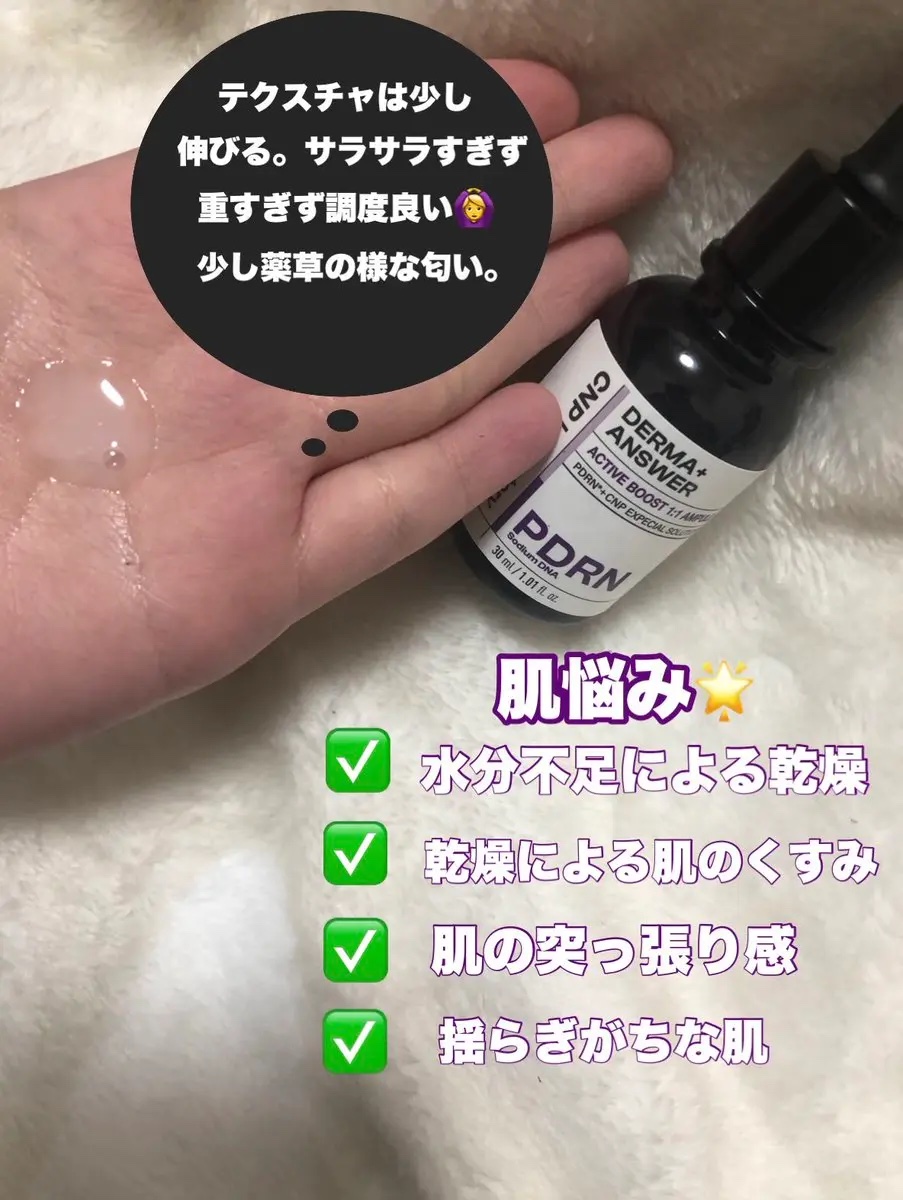 PDRNはエステのサーモン注射、水光注射の施術に使われてる高級原料✨ 肌の奥から弾力あるツヤ肌が目指せます。 とろみがあって濃厚なテクスチャー肌に滑らせるとすーっとなじみます。