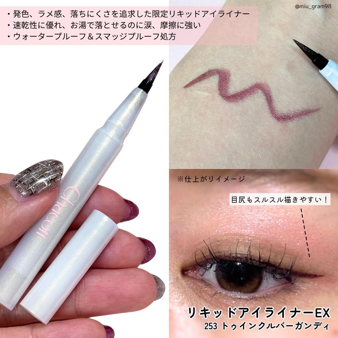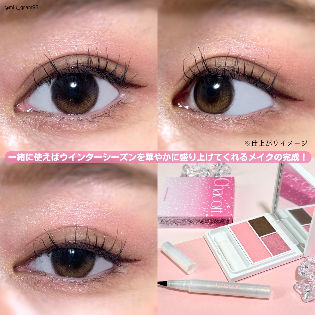 チャコットの冬期限定アイテムがかわいい🥺🎄.* 2024 WINTER LIMITED COLLECTION 🤍フェイスカラーパレットEX【516】煌めきに包まれた限定コレクション✩.*˚ アイブロウとしても使えるパレット🙌🏻 ピンクラメとブラウンの相性がいい!チークのピンクもかわいくて、お気に入り💗 発色、ラメ感、落ちにくさを追求したリキッドアイライナー。 ウォータープルーフ&スマッジプルーフ処方で摩擦に強い速乾タイプ。