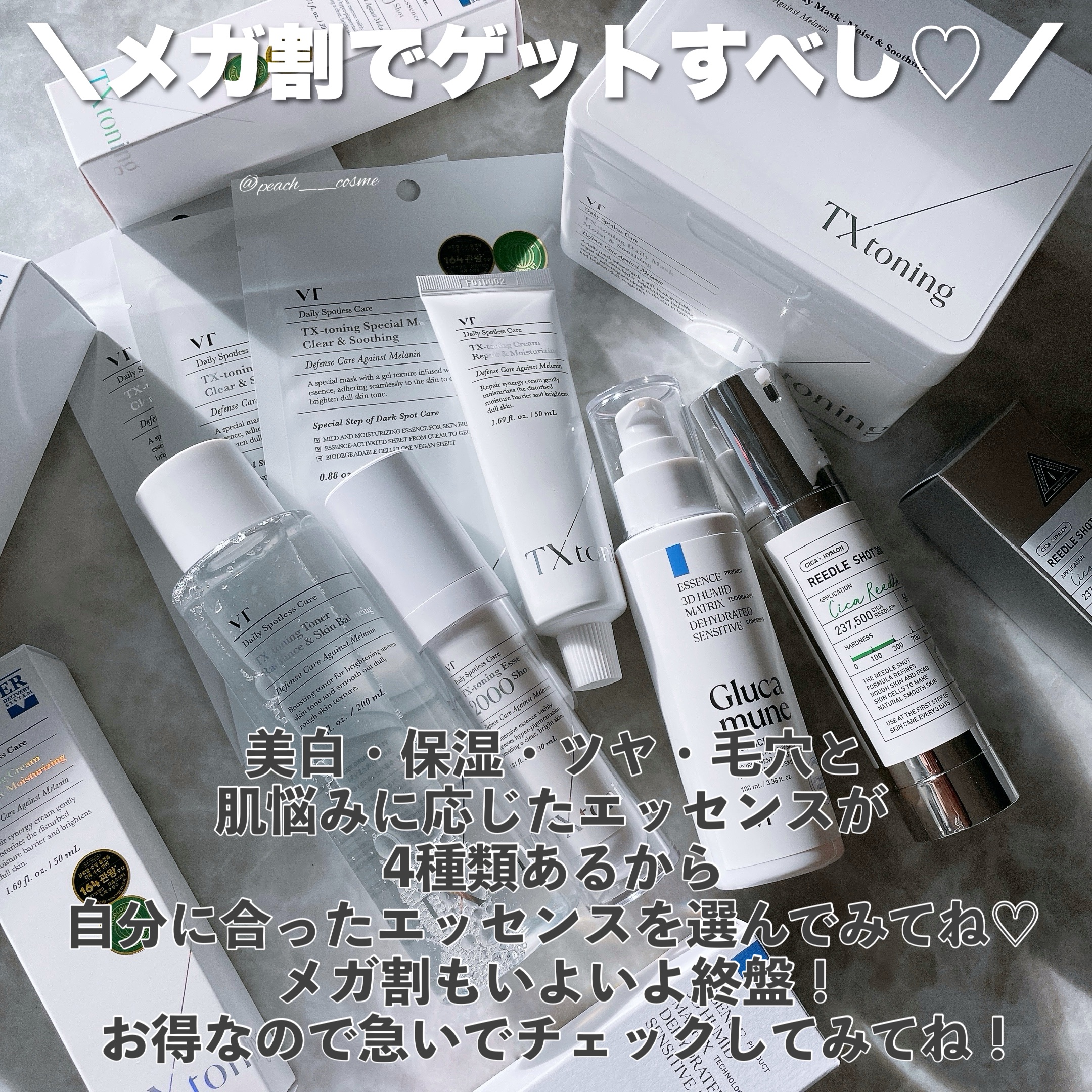 シミ・肝斑・色素沈着のケアに◎ TXトーニングシリーズ4種に水分爆弾で話題のグルカミューンエッセンスのお得なセットがメガ割にꉂꉂ📣!! TXトーニングトナー:使い方は3つ!→手で塗る:洗顔後、手に適量を取り肌の内側から外側へ伸ばし馴染ませます。→拭き取りトナー:洗顔後コットンにトナーを浸し肌をふき取ることで残った汚れや古い角質を優しくオフ! グルカミューンエッセンスは本当に家族全員使える?→幼児用スキンケアの基準で開発された商品で大切な家族全員この商品1本でケアできます。
