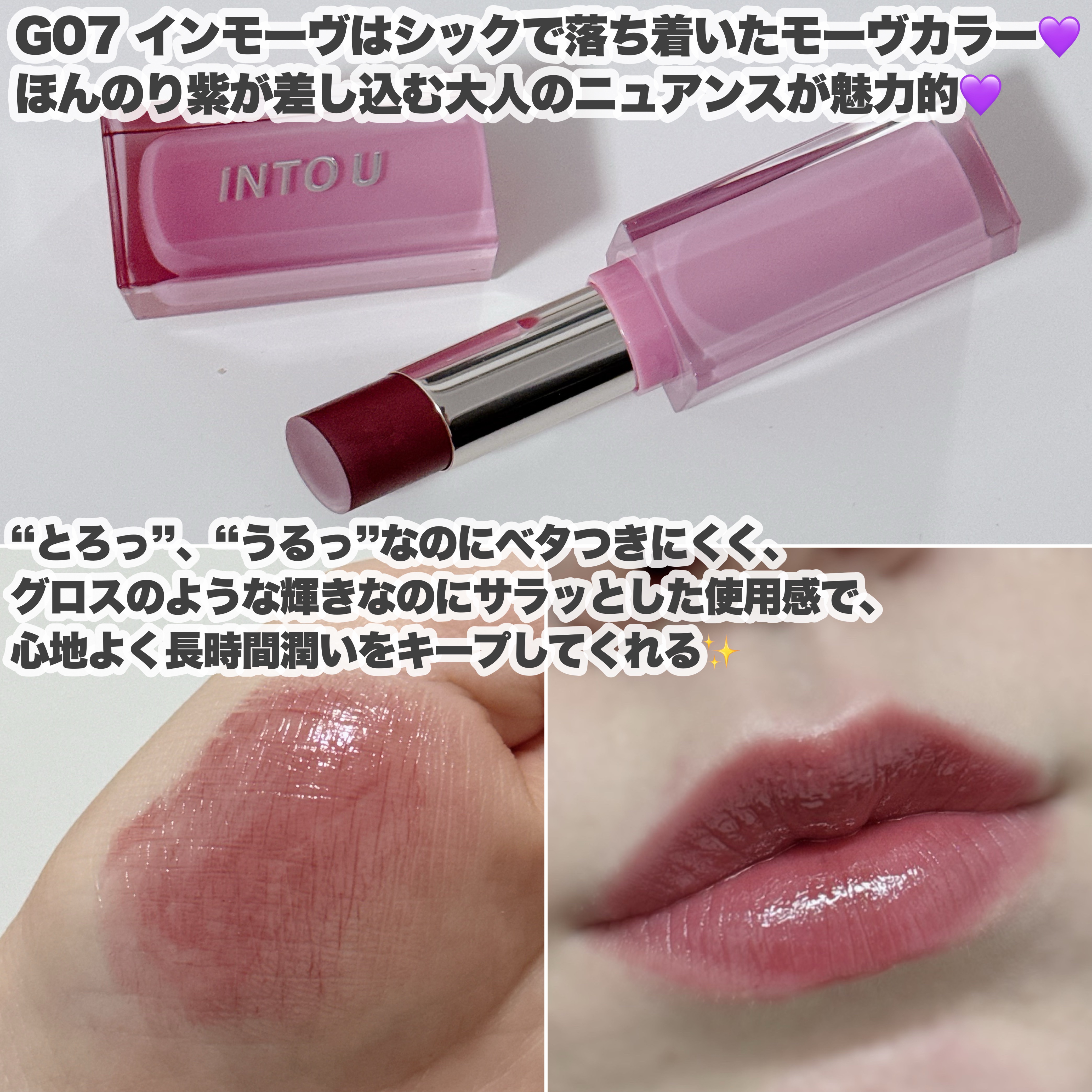 見た目は安定に可愛いし 持ってるだけでテンションあがる🤍 リップパック効果もあり 何と言ってもツヤも発色も凄い🌼 マスクうつりもしますし、持ちは良くないですが 手にスウォッチした際には少し残りました🌼 マスク生活が早く終わることを願って 1本買っておくのがオススメ🤍