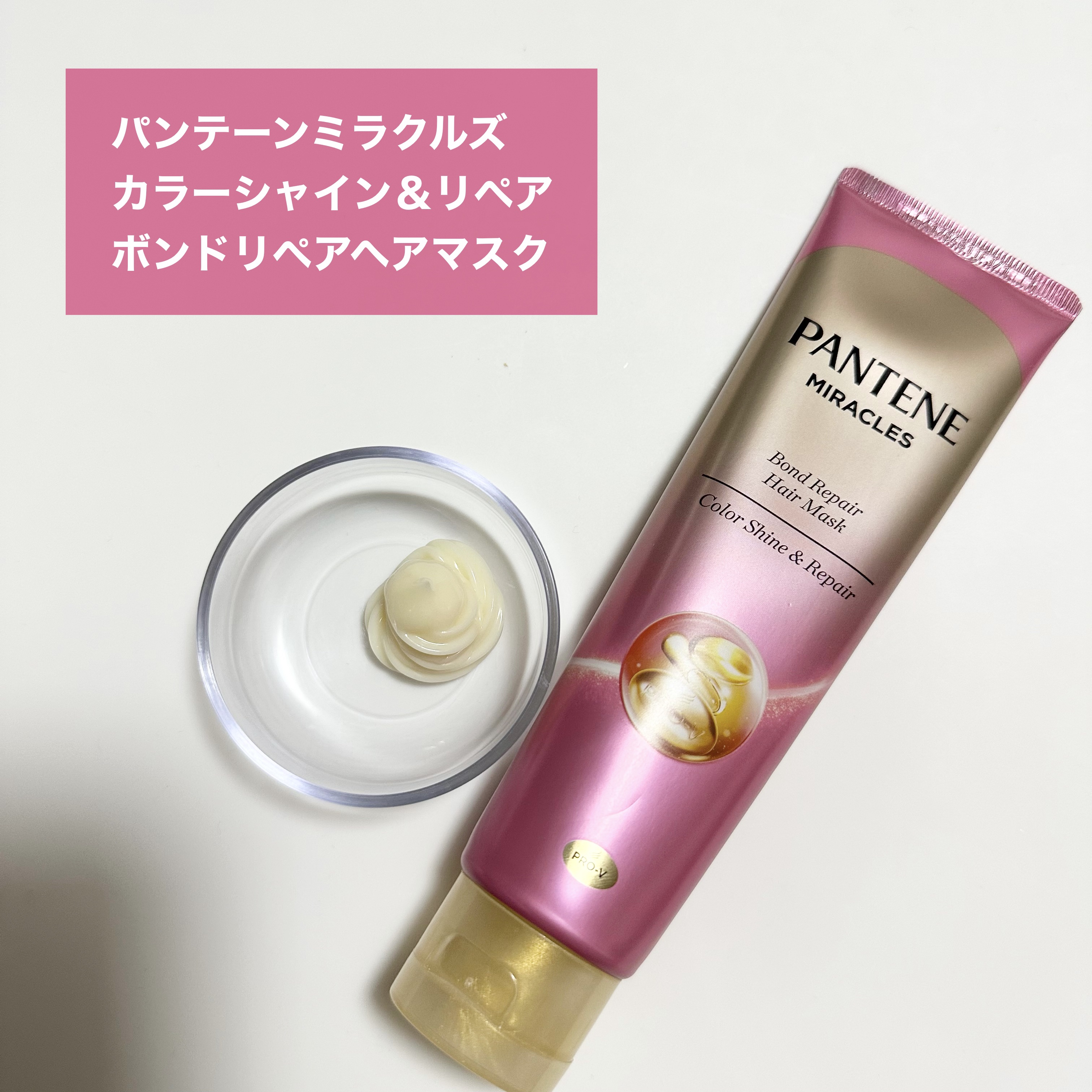 パンテーン エクストラダメージリペア インテンシブ ヴィタミルク 洗い流さないトリートメントはポンプタイプで使い勝手の良い、洗い流さないタイプのトリートメントです。内容量も125mLとたっぷり。黄色がかった色合いをしていて、見るからに濃厚そう! カラー後の色落ち防止(*シリーズ使いによる)、+4週間の綺麗な髪色長持ちを叶えてくれるラインのものです。香りは共にピンクローズ&マンダリンオレンジの香り。 パンテーンミラクルズ カラーシャイン&リペア ボンドリペア ヘアマスクは洗い流すタイプのトリートメントです。内容量は125g。贅沢感のある感触です。