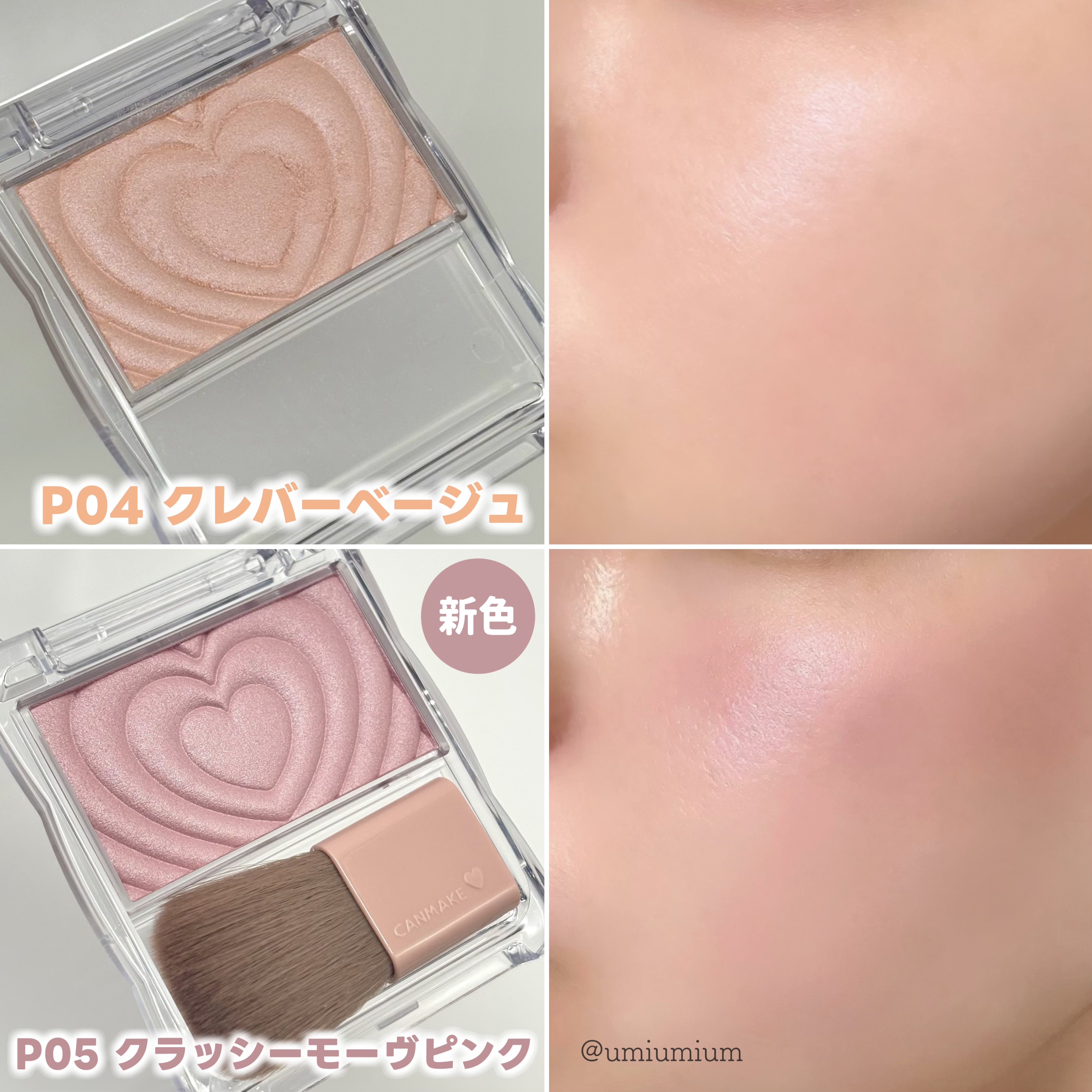 ハート可愛すぎるパウダーチークス全色スウォッチ💗❤︎︎︎︎❤︎キャンメイクパウダーチークス¥660❤︎︎︎︎❤︎ツヤが好きな方は絶対これ💗とりあえずパケが可愛い。ハート💗💗それも¥660でこれ👏凄すぎ👏P01パワフルピンク元気な印象になる王道...