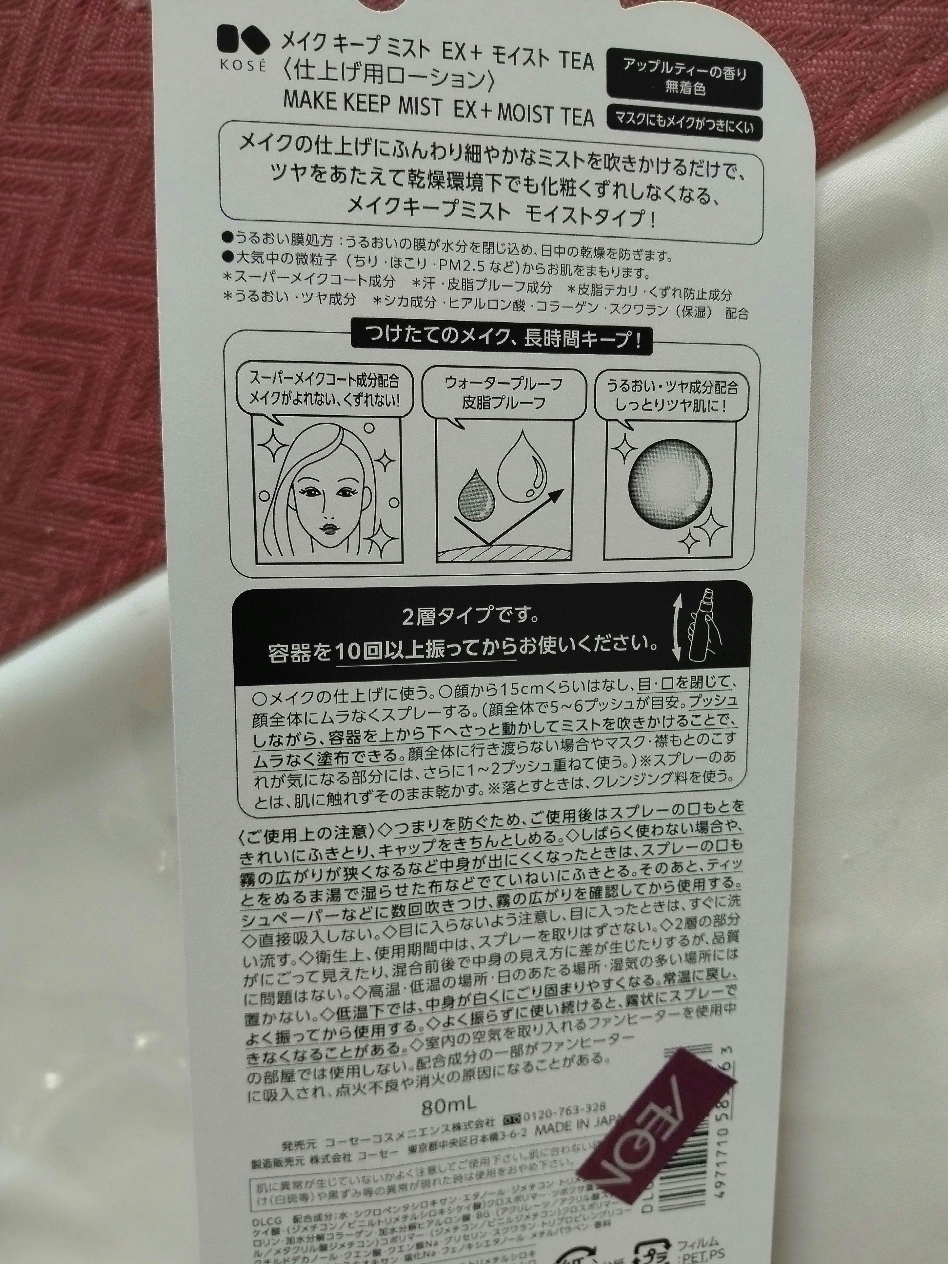 - メイク キープ ミスト EX + 長時間、化粧持ちデータ取得済み! ※当社調べ。個人差があります。 ●メイクの仕上げにシュッと吹きかけるだけで、蒸し暑い環境でも化粧くずれしにくくなるメイクキープミストです。 ●メイクよれ防止効果がプラスとなり、メイクキープ効果が衝撃パワーアップ! コーセーオリジナルの「スーパーメイクコート成分」を新配合。 表情の動きにもよれにくく高い柔軟性をもつため、 表情の変化によるメイクよれを防止。 美しい仕上がりをキープします。 ●スーパーウォータープルーフヘパワーアップ! 汗・水・涙にも強く、撥水効果を発揮します。 撥水性の高い膜が、 隙間なく均一に肌へ密着。 汗・ 水 ・ 涙をしっかりはじき、メイクくずれを防ぎます。 ●高い皮脂プルーフ効果で、 テカリ&毛穴落ち防止効果がパワーアップ! 皮脂テカリ・くずれ防止成分が皮脂をはじくと同時にテカリを防止。 テカリだけでなく、 メイクの毛穴落ちまで防ぎます。 ●高温多湿試験済み※! 蒸し暑い環境でもテカリやベタつきを防ぎ、 美しい仕上がりをキープします。 ※化粧もちに関して (コーセー調べ。 効果には個人差があります。) ●ふんわり細やかなミストが均一な1枚の膜を形成! つけたての美しいメイクを長時間キープ。 メイクをしっかり固定しながら、顔の動きに合わせて伸縮する膜を肌表面に形成。 時間が経ってもメイクがよれにくく、 美しい仕上がりが長時間持続します。 ●新配合のシカ成分をはじめとする数種の保湿成分を贅沢に配合! 肌にうるおいをあたえ、 乾燥を防ぎます。 マスク着用によるメイクのよれや、マスクへのメイク移りを防ぎます。 大気中の微粒子(ちり・ほこり・PM2.5など) からお肌をまもります。 ●アレルギーテスト済み ●ノンコメドジェニックテスト済み ※すべてのかたにアレルギーが起きない、コメド (ニキビのもと)ができないというわけではありません。 ジューシーフローラルの香り 無着色 ※スーパーメイクコート成分は(ジメチコン/ビニルトリメチルシロキシケイ酸)クロスポリマー、汗・皮脂プルーフ成分はトリメチルシロキシケイ酸、皮脂テカリ・くずれ防止成分は(ジメチコン/ビニルジメチコン)クロスポリマー、シカ成分はツボクサ葉エキス、ヒアルロン酸は加水分解ヒアルロン酸、コラーゲンは加水分解コラーゲンです。 <ご注意> 低温下では中身が白く固まりやすくなりますが、 常温に戻すために湯せんや電子レンジなどを使って高い温度で温めると品質が変化してしまいます。 さらには容器が変形・破損することで、やけどや怪我の恐れがあります。 大変危険ですので、湯せんや電子レンジなどを使って加熱することは絶対にお避けください。