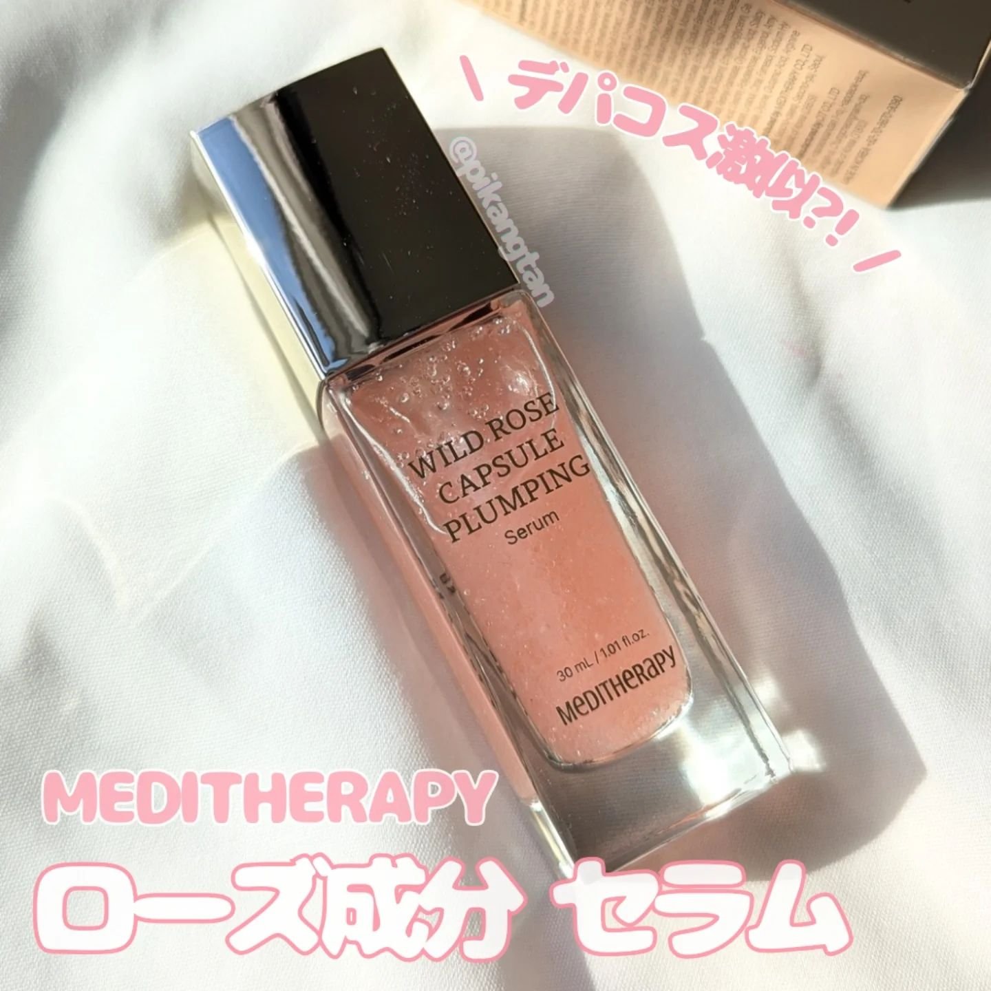 くすみやハリのなさが気になる方に💓 高級感のあるパッケージも素敵なメディテラピーの美容液✨️ テクスチャーはジュレのような感じ! ローズオイルカプセルは違和感なく肌に馴染んでいった🙆♀️ ほのかに薔薇の香りがして 心地よくスキンケアできた🌹