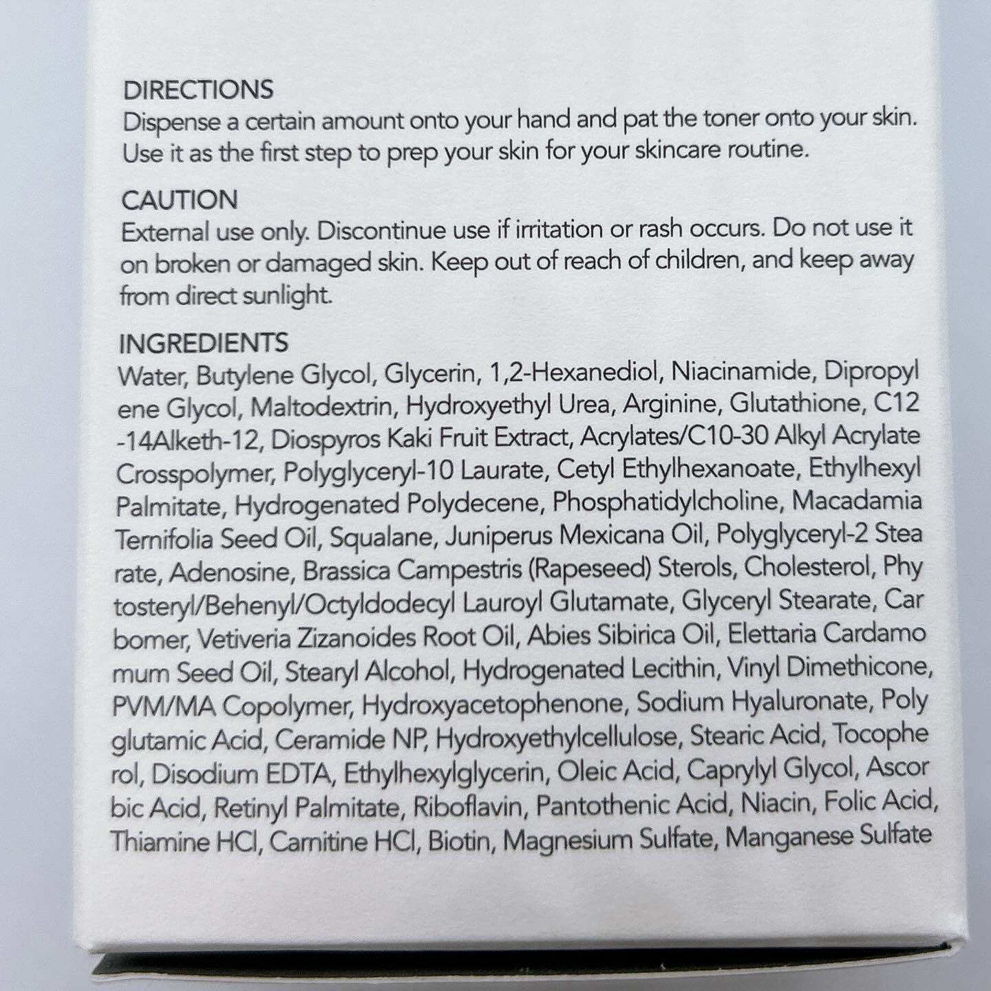 - <200ml> 水、BG、グリセリン、1,2-ヘキサンジオール、ナイアシンアミド、ジプロピレングリコール、マルトデキストリン、ヒドロキシエチルウレア、アルギニン、グルタチオン、(C12-14)アルケス-12、カキ果実エキス、(アクリレーツ/アクリル酸アルキル(C10-30))クロスポリマー、ラウリン酸ポリグリセリル-10、エチルヘキサン酸セチル、パルミチン酸エチルヘキシル、水添ポリデセン、ホスファチジルコリン、マカデミアナッツ油、スクワラン、ジュニペルスメキシカナ油、ステアリン酸ポリグリセリル-2、アデノシン、アブラナ種子ステロール、コレステロール、ラウロイルグルタミン酸ジ(オクチルドデシル/フィトステリル/ベヘニル)、ステアリン酸グリセリル、カルボマー、ベチベル根油、シベリアモミ油、ショウズク種子油、ステアリルアルコール、水添レシチン、(ジメチコン/ビニルジメチコン)クロスポリマー、(メチルビニルエーテル/マレイン酸)コポリマー、ヒドロキシアセトフェノン、ヒアルロン酸Na、ポリグルタミン酸、セラミドNP、ヒドロキシエチルセルロース、ステアリン酸、トコフェロール,EDTA-2Na、エチルヘキシルグリセリン、オレイン酸、カプリリルグリコール、アスコルビン酸、パルミチン酸レチニル、リボフラビン、パントテン酸、ナイアシン、葉酸、チアミン塩酸塩、カルニチン塩酸塩、ビオチン、硫酸マグネシウム、硫酸マンガン