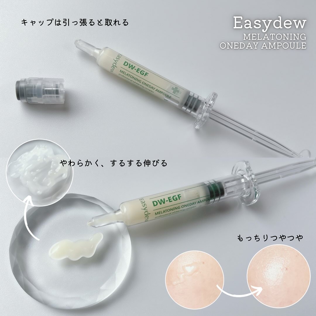 サラリとしたテクスチャー🫧 みずみずしくて、しっとり感を感じました!! 注射器のような容器に入っていて気になる部分に塗布して使えます◎ EGFは99% 高純度活性dw-egf成分が含まれているそう!!