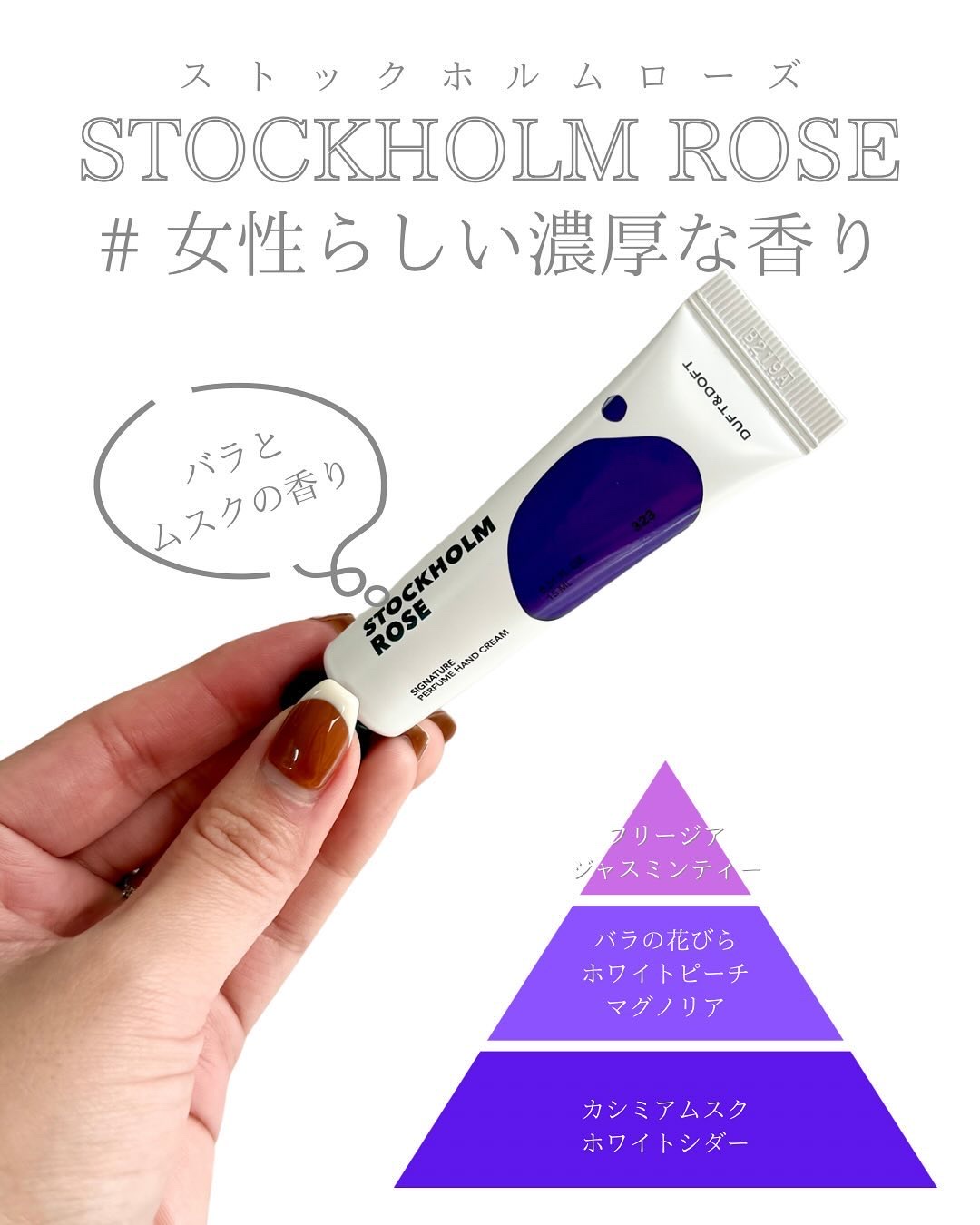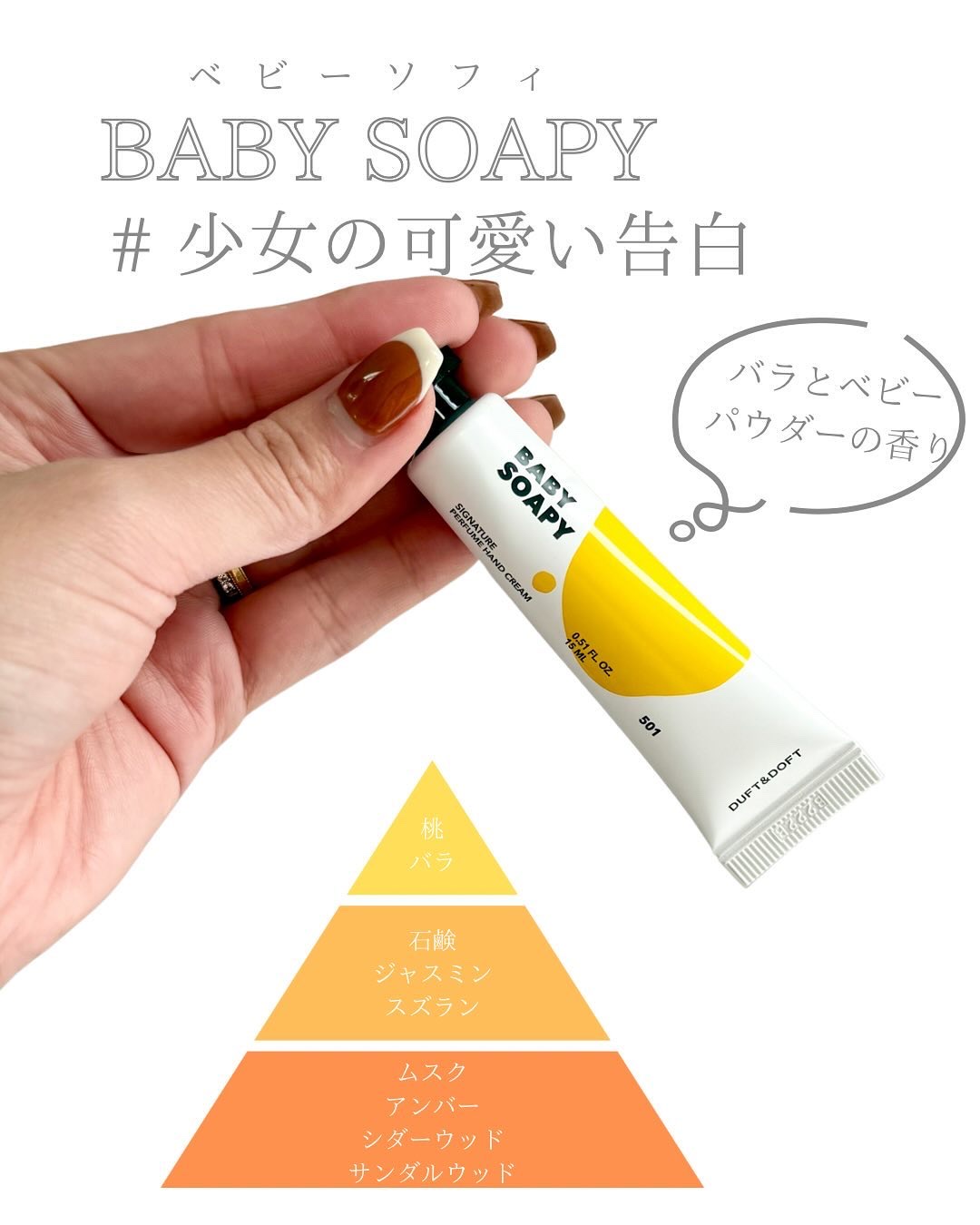 長時間積み重ねきた、香りのノウハウと専門調香師との協業を通じて 100時間以上の熟成を経って、厳選された香料と数千回の香りテストを経り誕生するダフト&ドフトのシグネチャー香りが特別な瞬間をお届け✨✨ 6種の香りから自分好みの香りを見つけられる💖 ❤︎Stockholm Rose(ストックホルムローズ) ❤︎Bloom Tulip (ブルームチューリップ ) ❤︎Angels Cotton (エンジェルズコットン ) ❤︎Baby Soapy(ベビーソフィ) ❤︎Pink Breeze(ピンクブリーズ) ❤︎Sophy Soapy(ソフィソフィ) 柔らかなクリーミーなテクスチャーでスッとお肌に馴染んでくれる💓 ベタつきもなくお肌をしっとり仕上げてくれるし、香りも長時間続くからケアしながら癒されます💗🤗