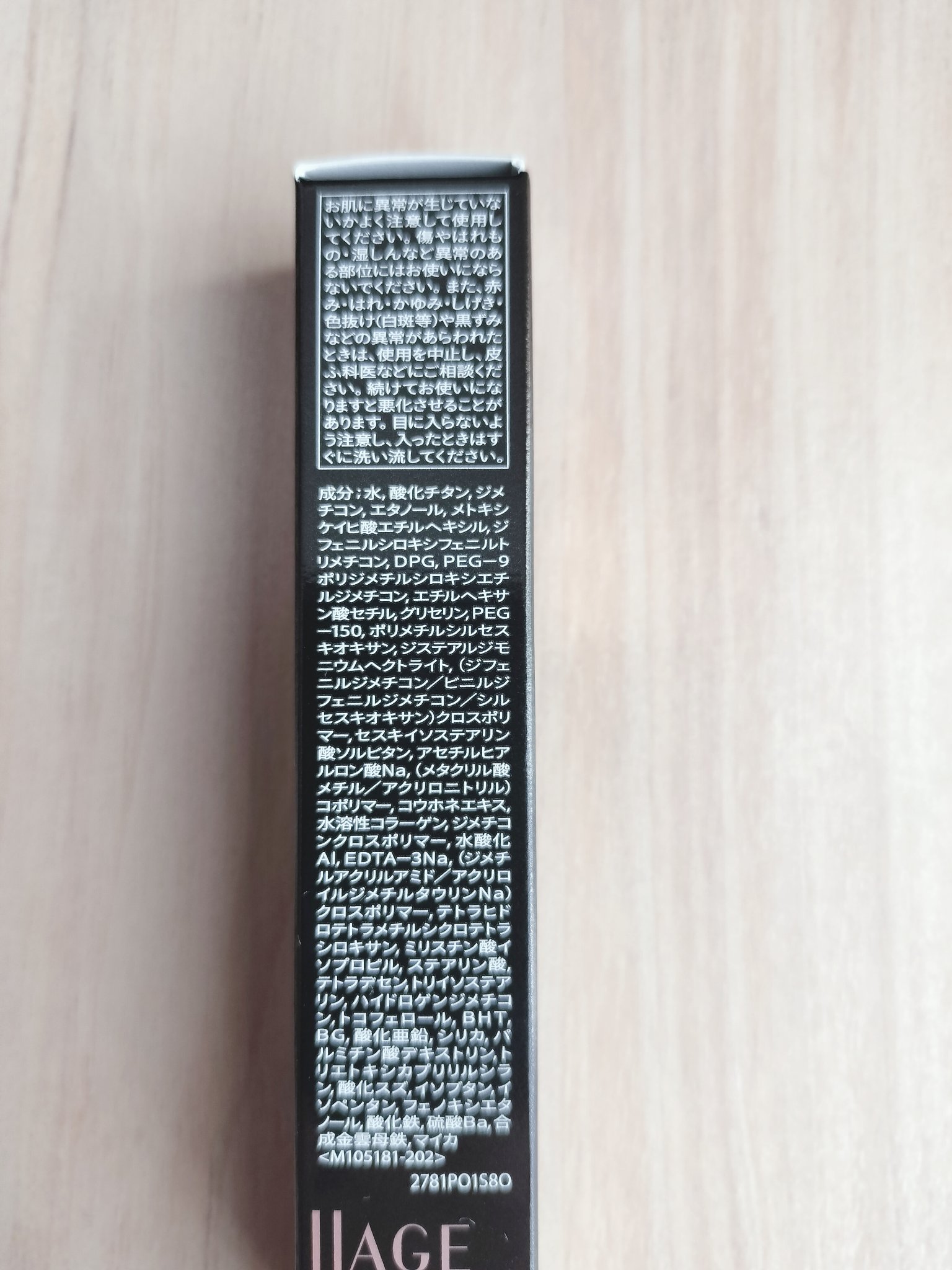 - <ライト> 水、酸化チタン、ジメチコン、エタノール、メトキシケイヒ酸エチルヘキシル、ジフェニルシロキシフェニルトリメチコン、DPG、PEG-9ポリジメチルシロキシエチルジメチコン、エチルヘキサン酸セチル、グリセリン、PEG-150、ポリメチルシルセスキオキサン、ジステアルジモニウムヘクトライト、(ジフェニルジメチコン/ビニルジフェニルジメチコン/シルセスキオキサン)クロスポリマー、セスキイソステアリン酸ソルビタン、アセチルヒアルロン酸Na、(メタクリル酸メチル/アクリロニトリル)コポリマー、コウホネエキス、水溶性コラーゲン、水酸化Al、ジメチコンクロスポリマー、EDTA-3Na、(ジメチルアクリルアミド/アクリロイルジメチルタウリンNa)クロスポリマー、テトラヒドロテトラメチルシクロテトラシロキサン、ミリスチン酸イソプロピル、ステアリン酸、テトラデセン、トリイソステアリン、ハイドロゲンジメチコン、トコフェロール、BHT、BG、酸化亜鉛、シリカ、パルミチン酸デキストリン、トリエトキシカプリリルシラン、酸化スズ、イソブタン、イソペンタン、フェノキシエタノール、酸化鉄、硫酸Ba、合成金雲母鉄、マイカ <ミディアム> 水、酸化チタン、ジメチコン、エタノール、メトキシケイヒ酸エチルヘキシル、ジフェニルシロキシフェニルトリメチコン、DPG、PEG-9ポリジメチルシロキシエチルジメチコン、エチルヘキサン酸セチル、グリセリン、PEG-150、ポリメチルシルセスキオキサン、ジステアルジモニウムヘクトライト、(ジフェニルジメチコン/ビニルジフェニルジメチコン/シルセスキオキサン)クロスポリマー、セスキイソステアリン酸ソルビタン、アセチルヒアルロン酸Na、(メタクリル酸メチル/アクリロニトリル)コポリマー、コウホネエキス、水溶性コラーゲン、ジメチコンクロスポリマー、水酸化Al、EDTA-3Na、(ジメチルアクリルアミド/アクリロイルジメチルタウリンNa)クロスポリマー、テトラヒドロテトラメチルシクロテトラシロキサン、ミリスチン酸イソプロピル、ステアリン酸、テトラデセン、トリイソステアリン、ハイドロゲンジメチコン、トコフェロール、BHT、BG、酸化亜鉛、シリカ、パルミチン酸デキストリン、トリエトキシカプリリルシラン、酸化スズ、イソブタン、イソペンタン、フェノキシエタノール、酸化鉄、硫酸Ba、合成金雲母鉄、マイカ