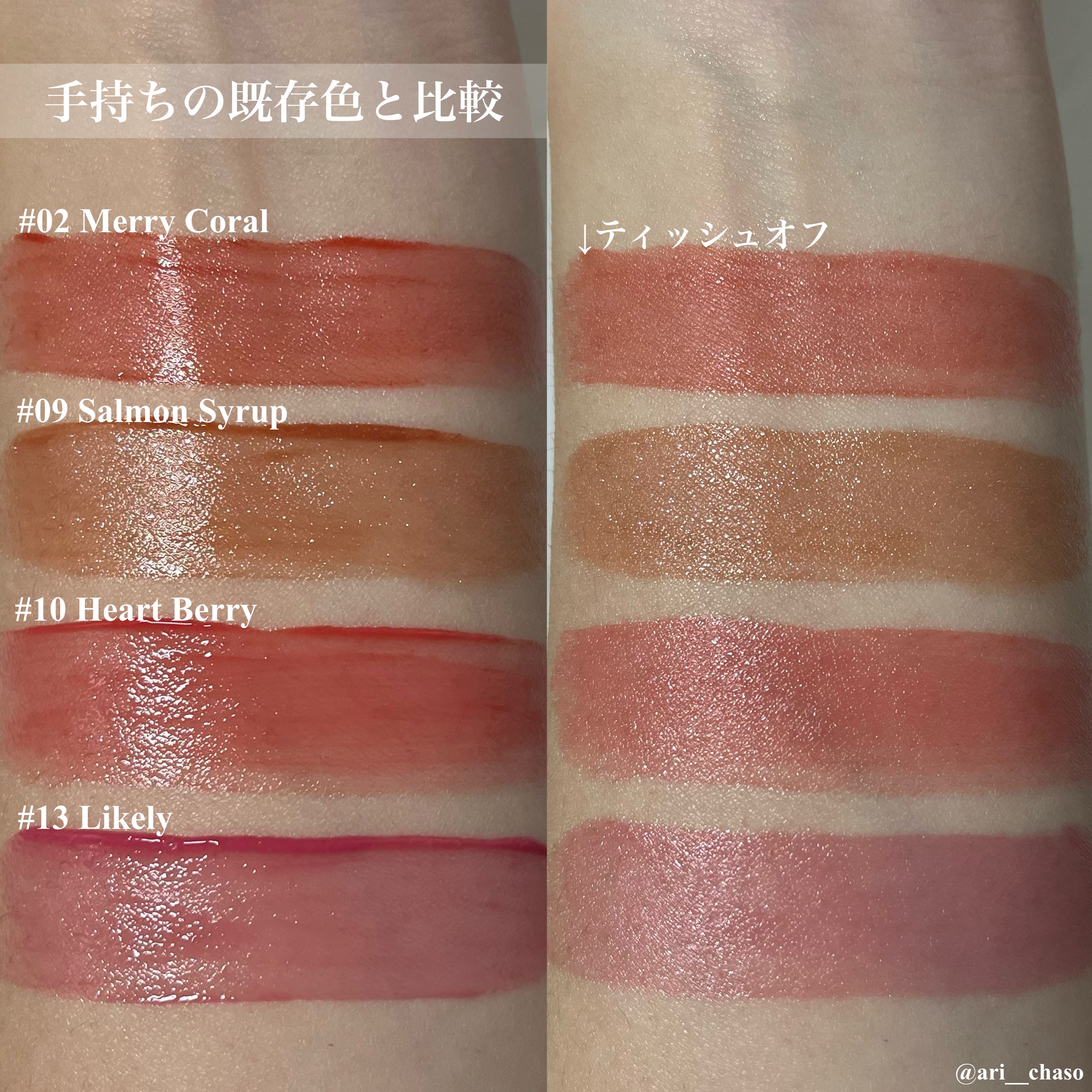 - <01 モーブローズ> リンゴ酸ジイソステアリル、水、ビスジグリセリルポリアシルアジペート-2、ジフェニルシロキシフェニルトリメチコン、トリメチルペンタフェニルトリシロキサン、ジグリセリン、水添ポリイソブテン、グリセリン、ペンチレングリコール、セチルPEG/PPG-10/1ジメチコン、イソステアリン酸ソルビタン、セテアレス-20、フェノキシエタノール、(アクリル酸ヒドロキシエチル/アクリロイルジメチルタウリンNa)コポリマー、スクワラン、クロレラエキス、グルコース、BG、香料、フルクトオリゴ糖、フルクトース、ジラウラミドグルタミドリシンNa、エチルヘキシルグリセリン、ポリソルベート60、エチレンジアミンジコハク酸3Na、水酸化Al、ポリアクリル酸アンモニウム、1,2-ヘキサンジオール、テトラ(ジ-t-ブチルヒドロキシヒドロケイヒ酸)ペンタエリスリチル、パルミチン酸エチルヘキシル、マルトデキストリン、アボカドエキス、トリベヘニン、パルミチン酸スクロース、水添レシチン、マカデミア種子油、オリーブ果実油、ホホバ種子油、ブドウ種子油、乳酸、パルミトイルトリペプチド-1 [+/-]酸化チタン、ホウケイ酸(Ca/チタン)、酸化スズ、黄4、黄5、赤104(1)、赤227、青1 <02 メリーコーラル> リンゴ酸ジイソステアリル、水、ビスジグリセリルポリアシルアジペート-2、ジフェニルシロキシフェニルトリメチコン、トリメチルペンタフェニルトリシロキサン、ジグリセリン、水添ポリイソブテン、グリセリン、ペンチレングリコール、セチルPEG/PPG-10/1ジメチコン、イソステアリン酸ソルビタン、セテアレス-20、フェノキシエタノール、(アクリル酸ヒドロキシエチル/アクリロイルジメチルタウリンNa)コポリマー、スクワラン、クロレラエキス、グルコース、BG、香料、フルクトオリゴ糖、フルクトース、ジラウラミドグルタミドリシンNa、エチルヘキシルグリセリン、ポリソルベート60、エチレンジアミンジコハク酸3Na、水酸化Al、ポリアクリル酸アンモニウム、1,2-ヘキサンジオール、テトラ(ジ-t-ブチルヒドロキシヒドロケイヒ酸)ペンタエリスリチル、パルミチン酸エチルヘキシル、マルトデキストリン、アボカドエキス、トリベヘニン、パルミチン酸スクロース、水添レシチン、マカデミア種子油、オリーブ果実油、ホホバ種子油、ブドウ種子油、乳酸、パルミトイルトリペプチド-1 [+/-]酸化チタン、ホウケイ酸(Ca/チタン)、酸化スズ、黄4、黄5、赤104(1)、赤227、青1 <03 サンドモンド> リンゴ酸ジイソステアリル、水、ビスジグリセリルポリアシルアジペート-2、ジフェニルシロキシフェニルトリメチコン、トリメチルペンタフェニルトリシロキサン、ジグリセリン、水添ポリイソブテン、グリセリン、ペンチレングリコール、セチルPEG/PPG-10/1ジメチコン、イソステアリン酸ソルビタン、セテアレス-20、フェノキシエタノール、(アクリル酸ヒドロキシエチル/アクリロイルジメチルタウリンNa)コポリマー、スクワラン、クロレラエキス、グルコース、BG、香料、フルクトオリゴ糖、フルクトース、ジラウラミドグルタミドリシンNa、エチルヘキシルグリセリン、ポリソルベート60、エチレンジアミンジコハク酸3Na、水酸化Al、ポリアクリル酸アンモニウム、1,2-ヘキサンジオール、テトラ(ジ-t-ブチルヒドロキシヒドロケイヒ酸)ペンタエリスリチル、パルミチン酸エチルヘキシル、マルトデキストリン、アボカドエキス、トリベヘニン、パルミチン酸スクロース、水添レシチン、マカデミア種子油、オリーブ果実油、ホホバ種子油、ブドウ種子油、乳酸、パルミトイルトリペプチド-1 [+/-]酸化チタン、ホウケイ酸(Ca/チタン)、酸化スズ、黄4、黄5、赤104(1)、赤227、青1 <04 フィグピーチ> リンゴ酸ジイソステアリル、水、ビスジグリセリルポリアシルアジペート-2、ジフェニルシロキシフェニルトリメチコン、トリメチルペンタフェニルトリシロキサン、ジグリセリン、水添ポリイソブテン、グリセリン、ペンチレングリコール、セチルPEG/PPG-10/1ジメチコン、イソステアリン酸ソルビタン、セテアレス-20、フェノキシエタノール、(アクリル酸ヒドロキシエチル/アクリロイルジメチルタウリンNa)コポリマー、スクワラン、クロレラエキス、グルコース、BG、香料、フルクトオリゴ糖、フルクトース、ジラウラミドグルタミドリシンNa、エチルヘキシルグリセリン、ポリソルベート60、エチレンジアミンジコハク酸3Na、水酸化Al、ポリアクリル酸アンモニウム、1,2-ヘキサンジオール、テトラ(ジ-t-ブチルヒドロキシヒドロケイヒ酸)ペンタエリスリチル、パルミチン酸エチルヘキシル、マルトデキストリン、アボカドエキス、トリベヘニン、パルミチン酸スクロース、水添レシチン、マカデミア種子油、オリーブ果実油、ホホバ種子油、ブドウ種子油、乳酸、パルミトイルトリペプチド-1 [+/-]酸化チタン、ホウケイ酸(Ca/チタン)、酸化スズ、黄4、黄5、赤104(1)、赤227、青1 <05 スコッチショット> リンゴ酸ジイソステアリル、水、ビスジグリセリルポリ