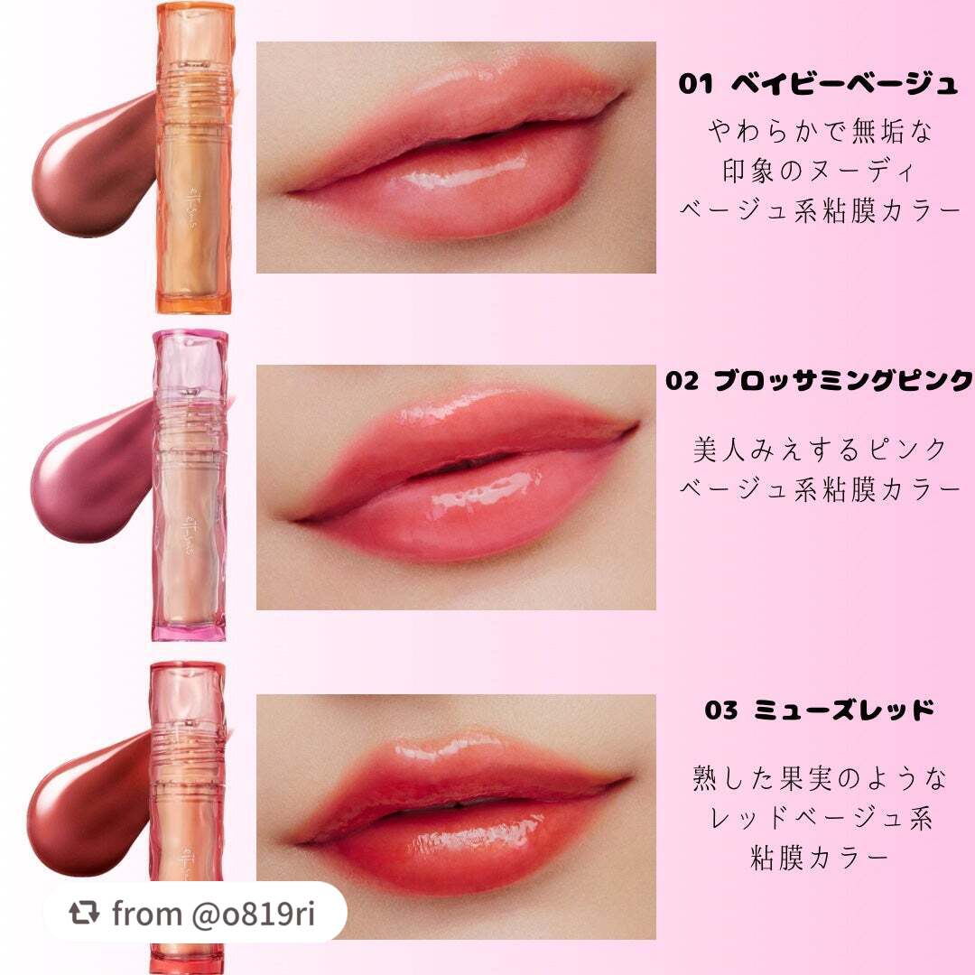 - 〇じゅわっとツヤがあふれてぷっくり仕上げ* *メイクアップ効果による ー塗ったあとにツヤオイル膜が浮き上がる、ツヤUPテクノロジー ー清涼成分メントキシプロパンジオール配合 〇オイルインウォーター処方で、うるおい感のあるちゅるんとした塗り心地 ー美容オイル配合 〇ティント成分配合で、色落ちしにくい 〇唇にフィットし、細部まで塗りやすいスパチュラタイプ 〇無香料