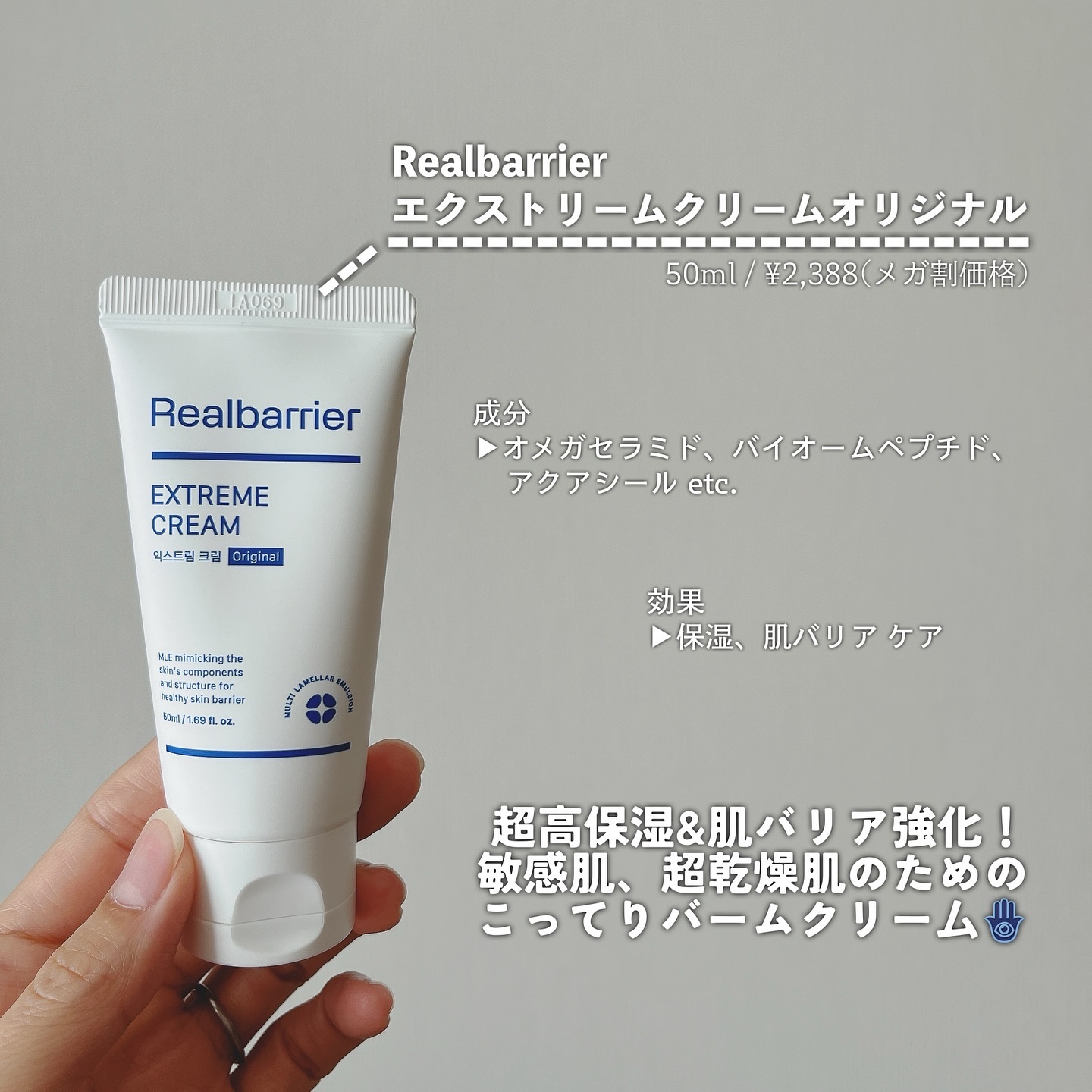 肌バリア専門ブランド、リアルバリアは肌のバリア構造と類似した構造を持つ敏感肌のためのスキンケア製品を販売✨️ 肌バリア回復クリームとして有名な「エクストリームクリームオリジナル」はこってりバームテクスチャーでしっとり🩵 「エクストリームエッセンストナーオリジナル」は独自開発オメガセラミド配合。弱くなった肌のバリアを強化💪🏻