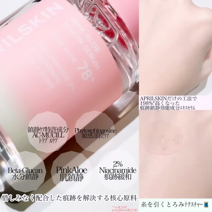 あのピンクアロエ!!!一般アロエ成分内polyhenol配合量対比で198%も高い鎮静成分🫧 ピンクアロエ78%🩷ナイアシンアミド・ビタ7種などなど痕跡ケアだけじゃなく水分ケアもできちゃう この容器のフタが工夫されてて直接肌にのせられる🩷刺激を極力なくす工夫がされてて嬉しいね💕