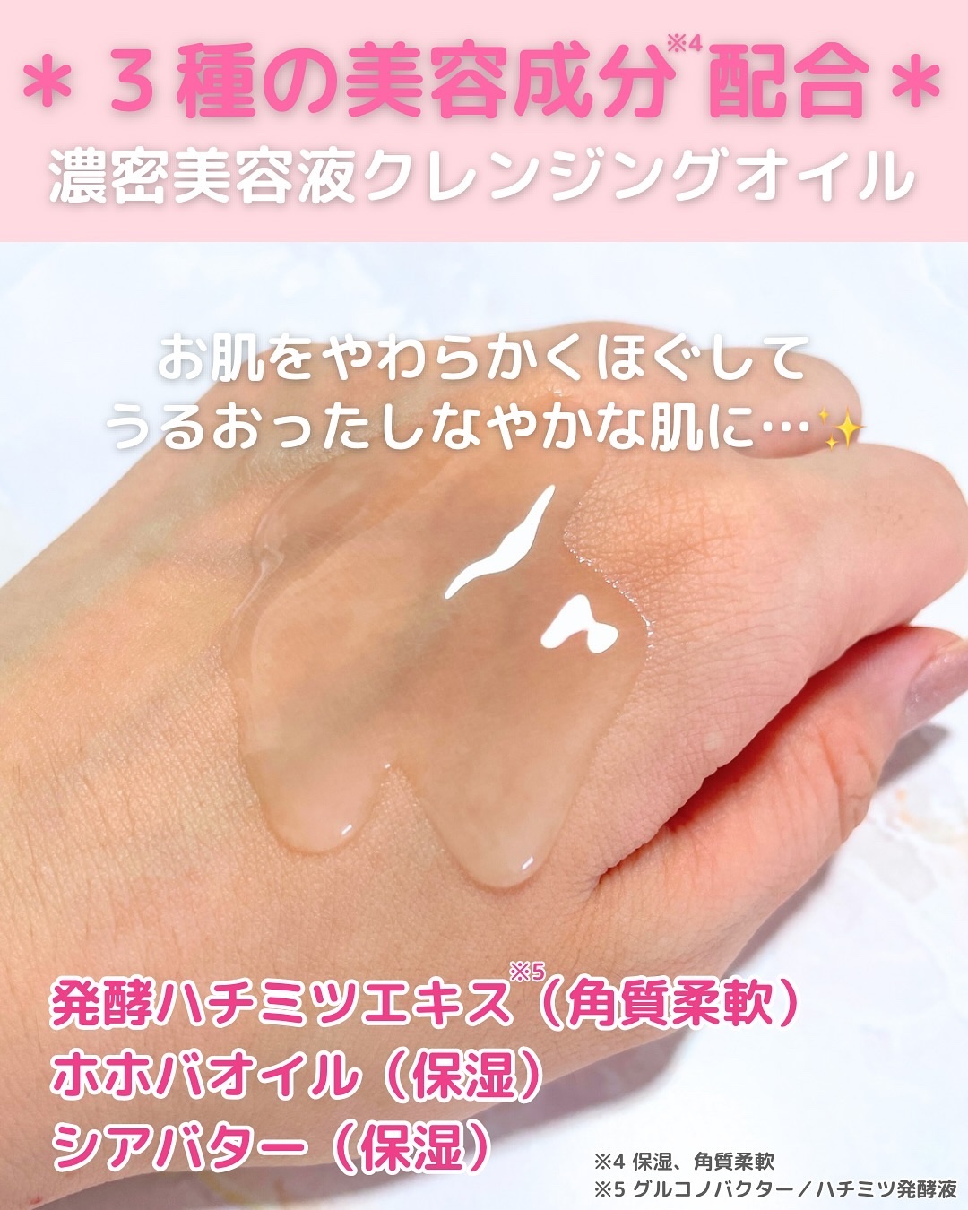 - 毛穴の黒ずみ汚れ・角栓やしっかりメイクも溶かして落としながら保湿も叶える濃密美容液クレンジングオイルです。角質柔軟成分の発酵ハチミツエキス※1、保湿成分のシアバター・ホホバオイル配合で、肌をやわらかくほぐししなやか肌に導きます。 ぬれた手でも使用でき、W洗顔不要でまつエク※2OK。合成香料フリー、着色剤フリー、アルコールフリー(エタノール無添加)、パラベンフリー。 ※1 グルコノバクター/ハチミツ発酵液 ※2 一般的なグルー(シアノアクリレート系)をご使用の場合