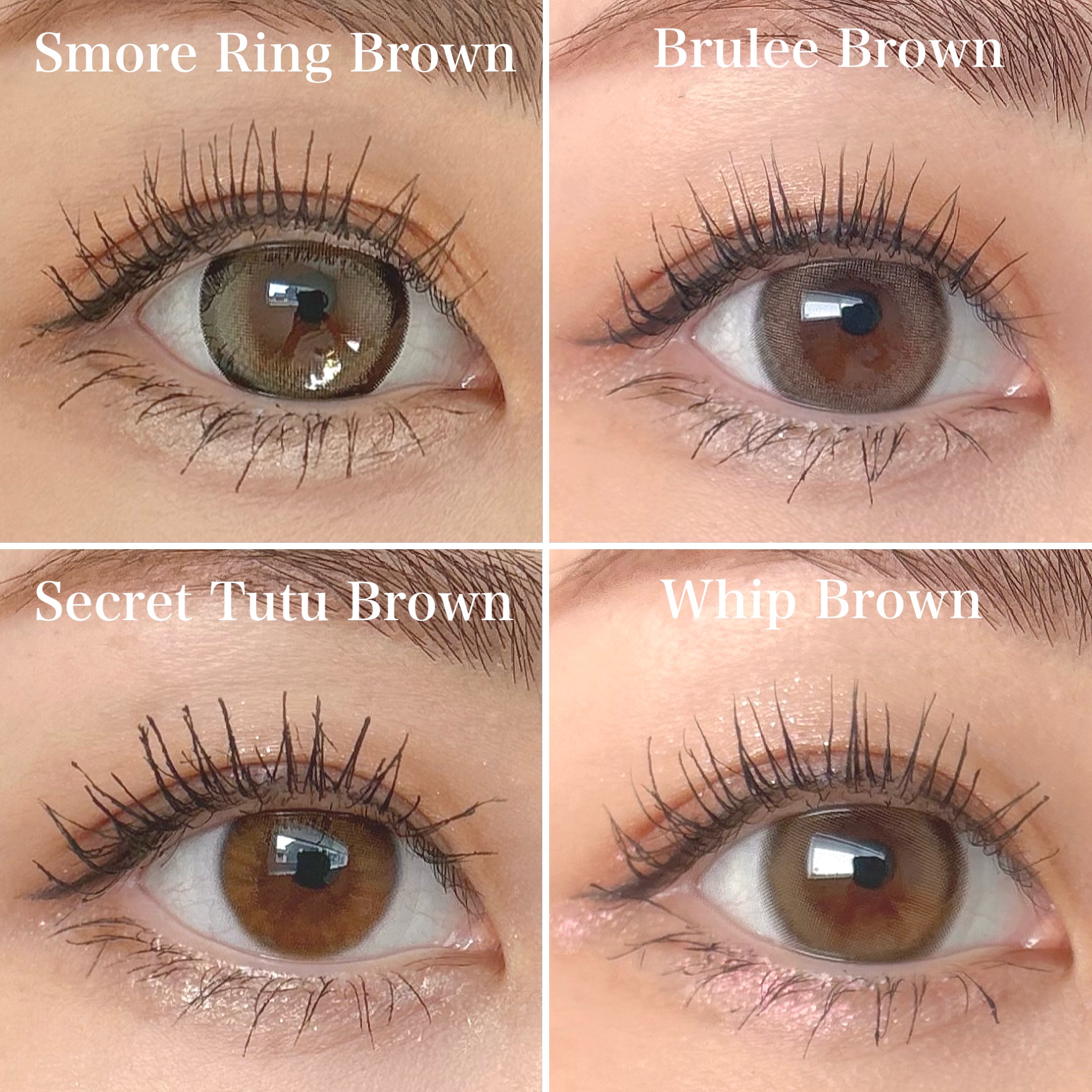 - ※2025年6月以降、商品パッケージ裏面・側面の一部表記を順次変更いたします。尚、これにかかる商品の交換・返品は承っておりません。 『わたしにハマる♡盛れ発色ブラウン』4色のカラーラインナップ ■ヒミツのちゅるんブラウン Secret Tutu Brown (シークレットチュチュブラウン) DIA:14.2mm 着色直径:11.2mm ニュアンスブラウンカラーが自然に瞳のトーンアップを演出してくれる裸眼風デート系レンズ。 ■はかなげ大人っぽブラウン Brulee Brown(ブリュレブラウン) DIA:14.5mm 着色直径:13.8mm トレンドの白っぽブラウン×ふわっとフチデザインで、大人っぽい瞳を演出。 ■甘っぽモテブラウン Whip Brown(ホイップブラウン) DIA:14.5mm 着色直径:13.8mm まろやかベージュブラウン×ぼかしフチデザインで、明るく優し気な瞳を演出。 ■あざとよくばりブラウン Smore Ring Brown(スモアリングブラウン) DIA:14.5mm 着色直径:13.8mm こなれアッシュブラウン×くっきり太フチデザインで、きゅるっと可愛らしい瞳を演出。 カラーコンタクトレンズの不適正使用による眼障害の危険性等などがあります。 ●コンタクトレンズは高度管理医療機器です。不十分な洗浄・消毒など不適切なケアや、長時間・交換期間を超えた装用により、アレルギー性結膜炎、角膜感染症、角膜潰瘍等の重篤な眼障害が発生する危険性があります ●ご使用前に取扱説明書を確認してください 使用上の留意事項 ●眼科医院等を受診してからお求めください ●眼に異常を感じたら直ちにレンズ使用を中止し、お近くの眼科等で診察を受けてください ●医師の指示にしたがってご使用ください ●コンタクトレンズを装用する場合、自覚症状がなくても、眼科医院等での定期検査を受けてください ●レンズに不具合がある場合は使用しないでください