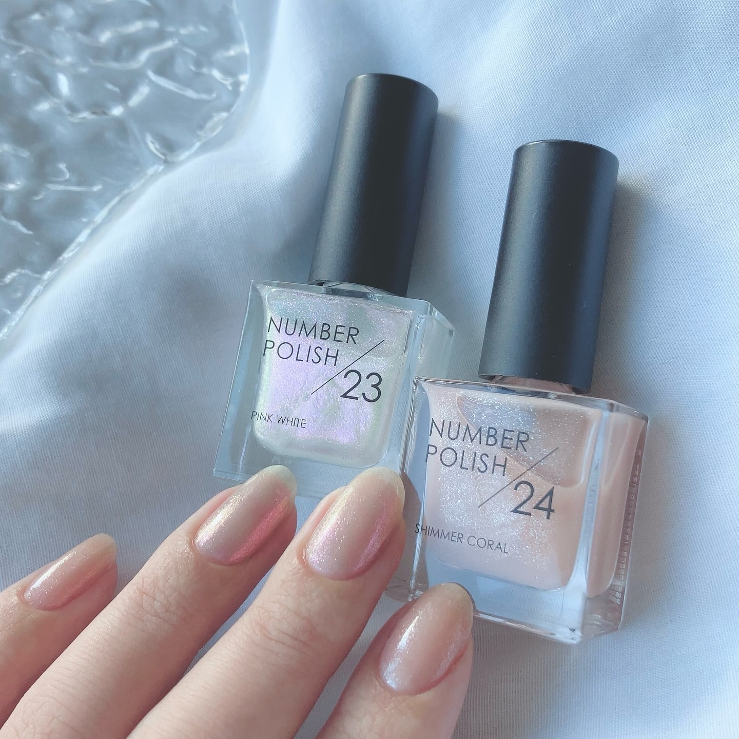 23 Pink Whiteは、偏光ピンクパールがきらめくシアーホワイト🤍 クリスマスとかにも合いそうで可愛い🎄 24 Shimmer Coralは、微粒子ラメがきらめくコーラルピンク🩷 肌なじみも良くてナチュラルで可愛い! どちらも2度塗りしてあるよ。 可愛いので是非チェックしてみてね✓