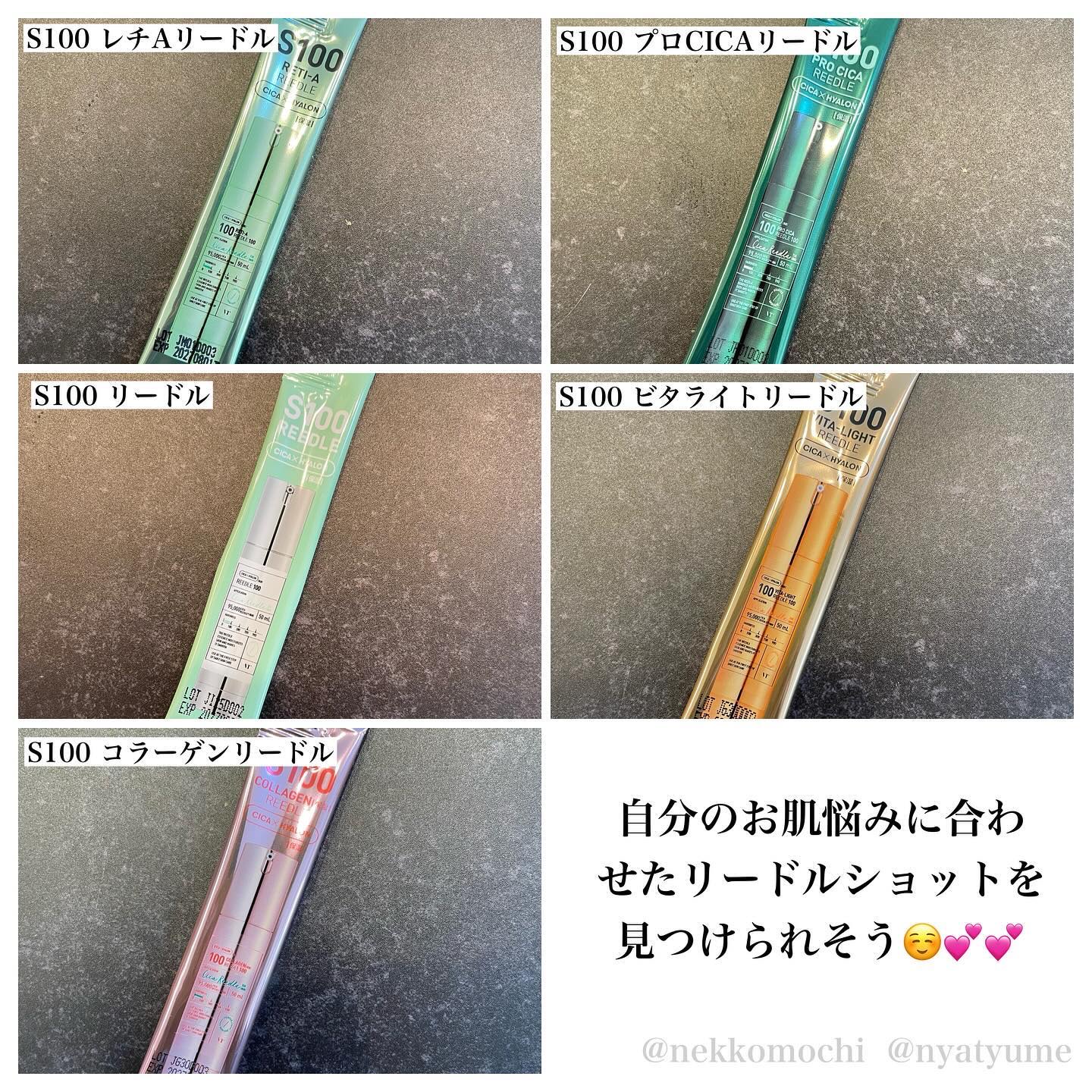 - <S100 レチAリードル> 水、DPG、グリセリン、ナイアシンアミド、BG、マカデミア種子油、1,2-ヘキサンジオール、パルミチン酸エチルヘキシル、ポリアクリル酸Na、(アクリル酸Na/アクリロイルジメチルタウリンNa)コポリマー、ステアリン酸グリセリル、ステアリン酸ポリグリセリル-6、ウコン根エキス、ポリイソブテン、グリセレス-26、シリカ、エチルヘキシルグリセリン、カプリリルグリコール、キサンタンガム、アデノシン、メリアアザジラクタ花エキス、(カプリリル/カプリル)グルコシド、オレイン酸ソルビタン、ベヘン酸ポリグリセリル-6、メリアアザジラクタ葉エキス、ヒアルロン酸Na、メリアアザジラクタ樹皮エキス、サンゴモエキス、カミメボウキ葉エキス、ワサビノキ種子油、ツボクサエキス、バクチオール、ジメチルイソソルバイド、ヒマワリ種子油、β-カロチン、レチノイン酸ヒドロキシピナコロン、レシチン、ポリソルベート20、レチノール、プロポリスエキス、カキ葉エキス、ブドウ果実エキス、アラビアコーヒーノキ種子エキス、ベニバナ花エキス、イタドリ根エキス、アシアチコシド、クリ殻エキス、チャ葉エキス、サンショウ果実エキス、マデカッソシド、マデカシン酸、アシアチン酸