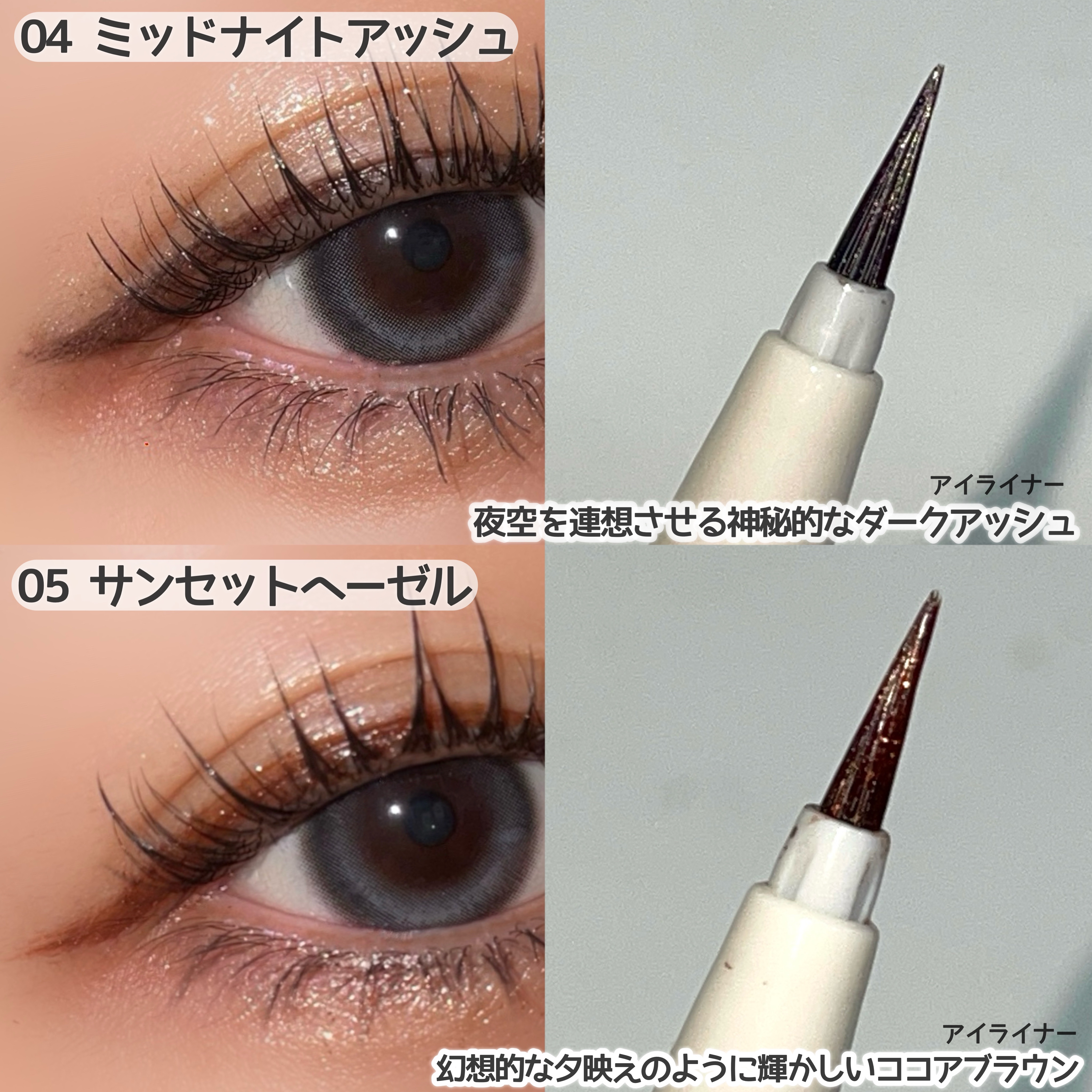 高密着でフィルムっぽく乾くけどパリパリしなくて良い🫢💓 筆も細いのでライナーとしてはもちろん、涙袋や目頭のキワにも使いやすいよ♪ 雪の結晶みたいな煌めきのシルバーパール🩶 細かいシルバーのラメが繊細できれい✨しっかりラメがのって華やかな目元になるよ♪ 月明かりのように艶やかなシャンパンゴールド🧡 ギラギラすぎないゴールドが上品✨01よりもラメ感は控えめな感じがします♪