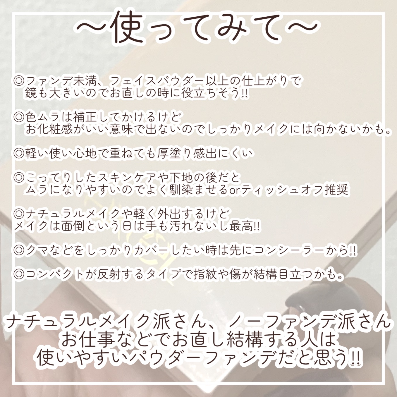 仕上がり綺麗。崩れにくい。乾燥崩れもしにくかった。 嫌なところ1個もない ツヤが綺麗な白玉肌が長時間続くところが好き!! 1日使ってても「早くメイク落とした〜い」となりにくいので肌への負担も感じにくい