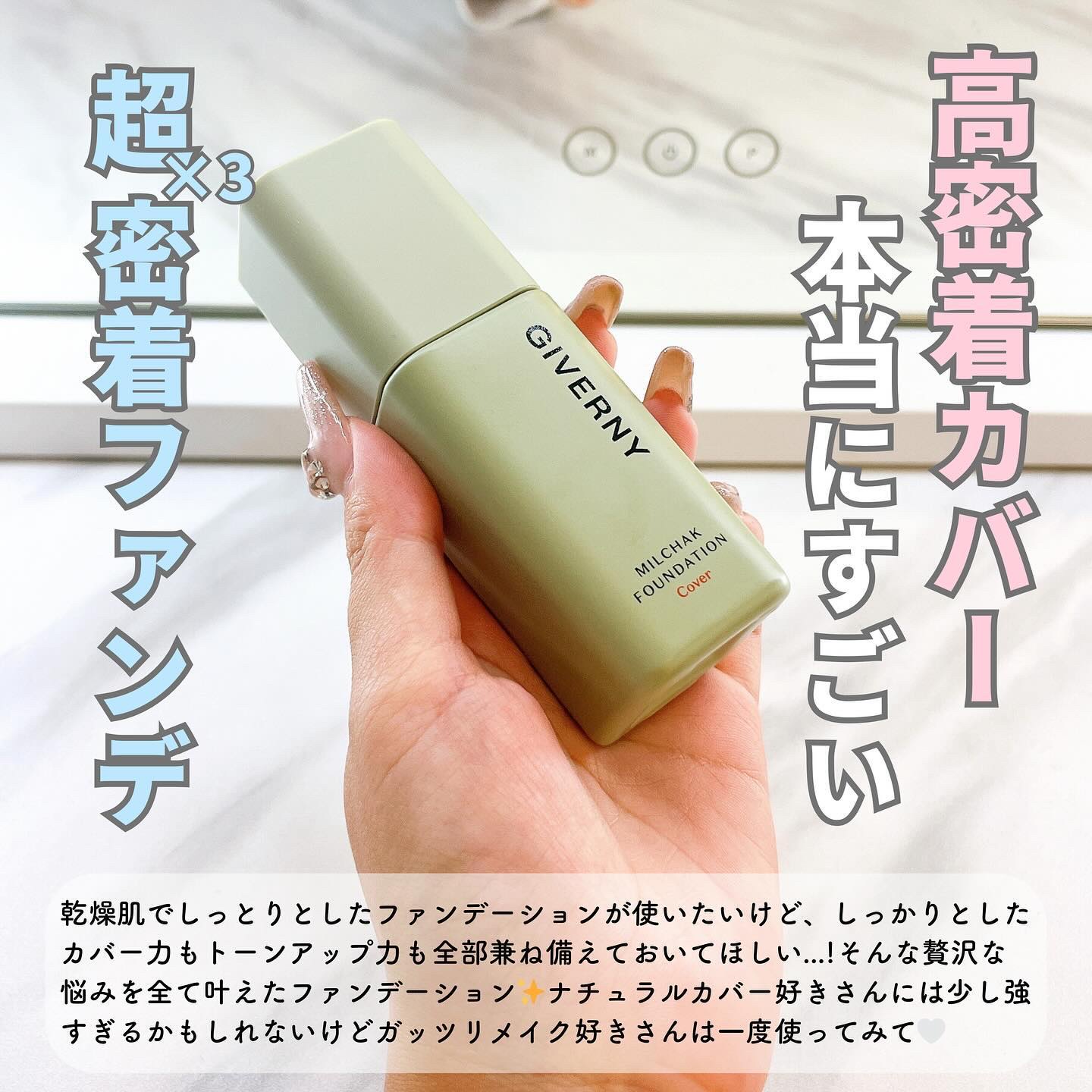 #魅せ肌のつるすべケア.♡@giverny_japanGIVERNY(ジヴェルニー)の密着カバーセットをお試ししてみたよ⋆⸜💚⸝⋆♡MilchakFoundationCover/SPF30PA++素肌っぽいが叶うファンデ!見た目はセミマット...