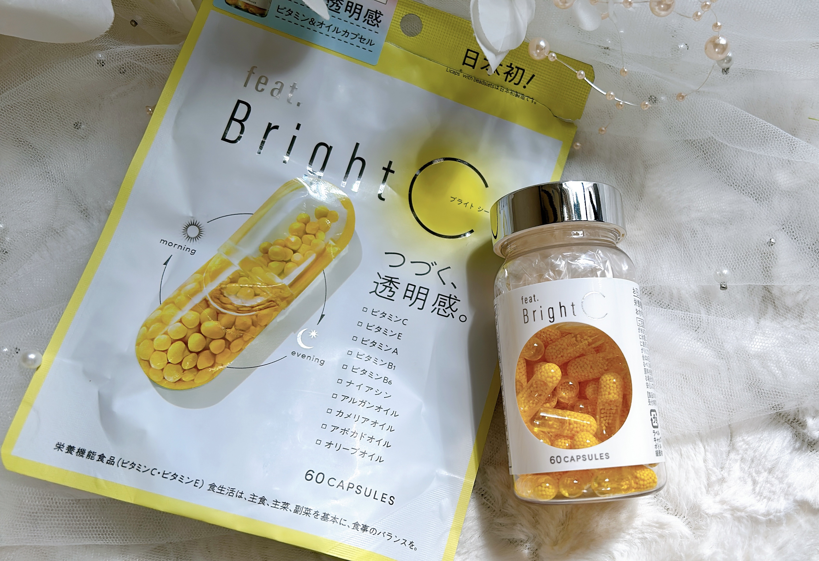 - 時間をかけてじっくり溶ける多重構造のビタミンCビーズをカプセルにぎゅっと詰め込みました。また、美容にうれしいアルガンオイル、カメリアオイル、アボカドオイル、オリーブオイルにビタミンE・ビタミンAも同時に摂れる美容液設計のカプセルです。 キレイ習慣をサポートする、栄養機能食品です。 【栄養機能食品(ビタミンC・ビタミンE)】 ビタミンCは、皮膚や粘膜の健康維持を助けるとともに、抗酸化作用を持つ栄養素です。 ビタミンEは、抗酸化作用により、体内の脂質を酸化から守り、細胞の健康維持を助ける栄養素です。 ●本品は、多量摂取により疾病が治癒したり、より健康が増進するものではありません。 ●1日の摂取目安量を守ってください。 ●本品は、特定保健用食品と異なり、消費者庁長官による個別審査を受けたものではありません。 ●食生活は、主食、主菜、副菜を基本に、食事のバランスを。