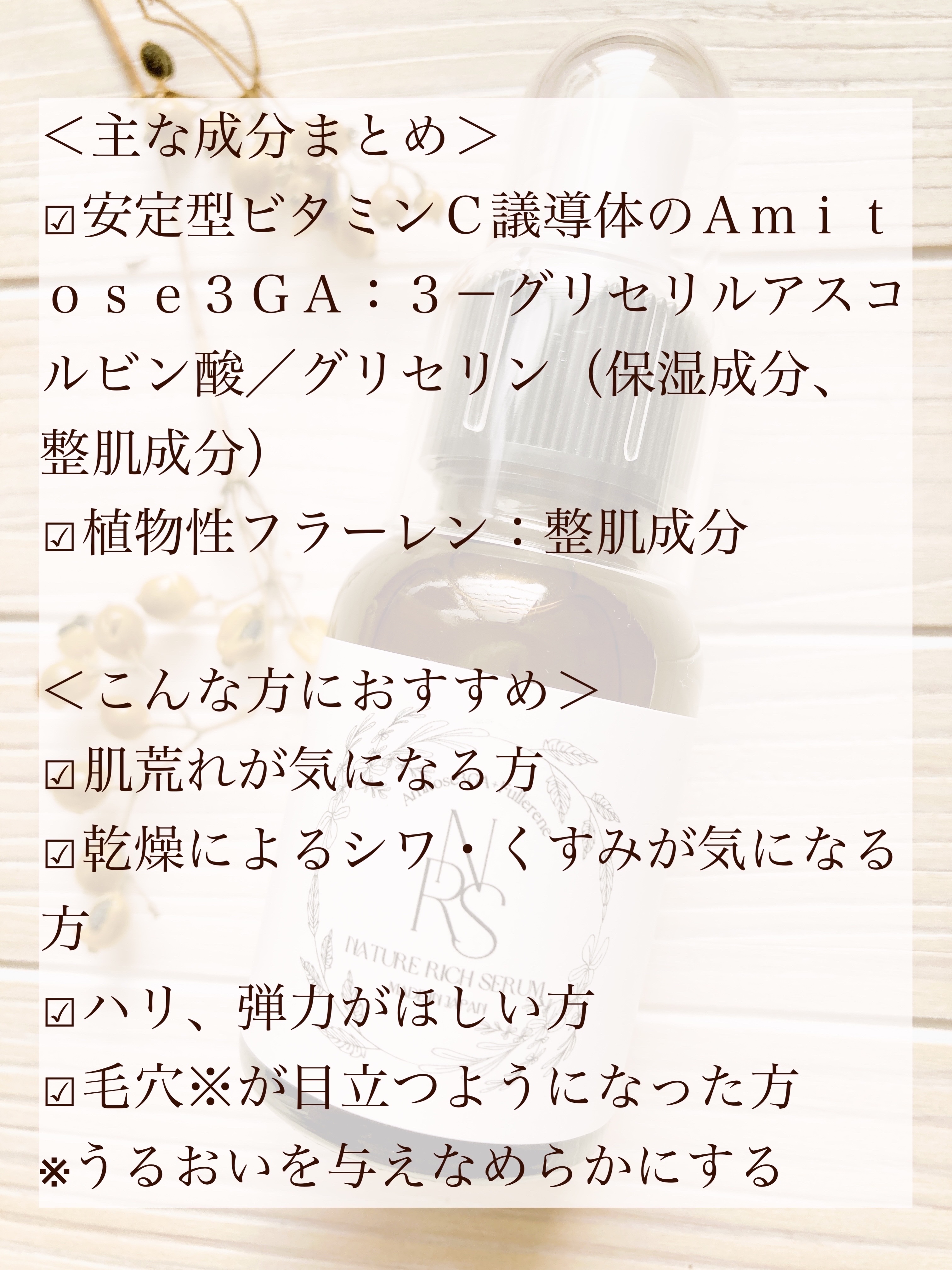 安定型ビタミンC誘導体のAmitose3GAと植物性フラーレンを配合し、年齢肌にアプローチしてくれる高保湿な美容液。 うるおいで満たす事で紫外線ダメージからお肌を守ってくれて健康的なお肌に整えてくれるの。 引き締まったハリ感ある仕上がり♡ 国産美容液を探してる方やエイジングケアが気になる方はチェックしてみて✅