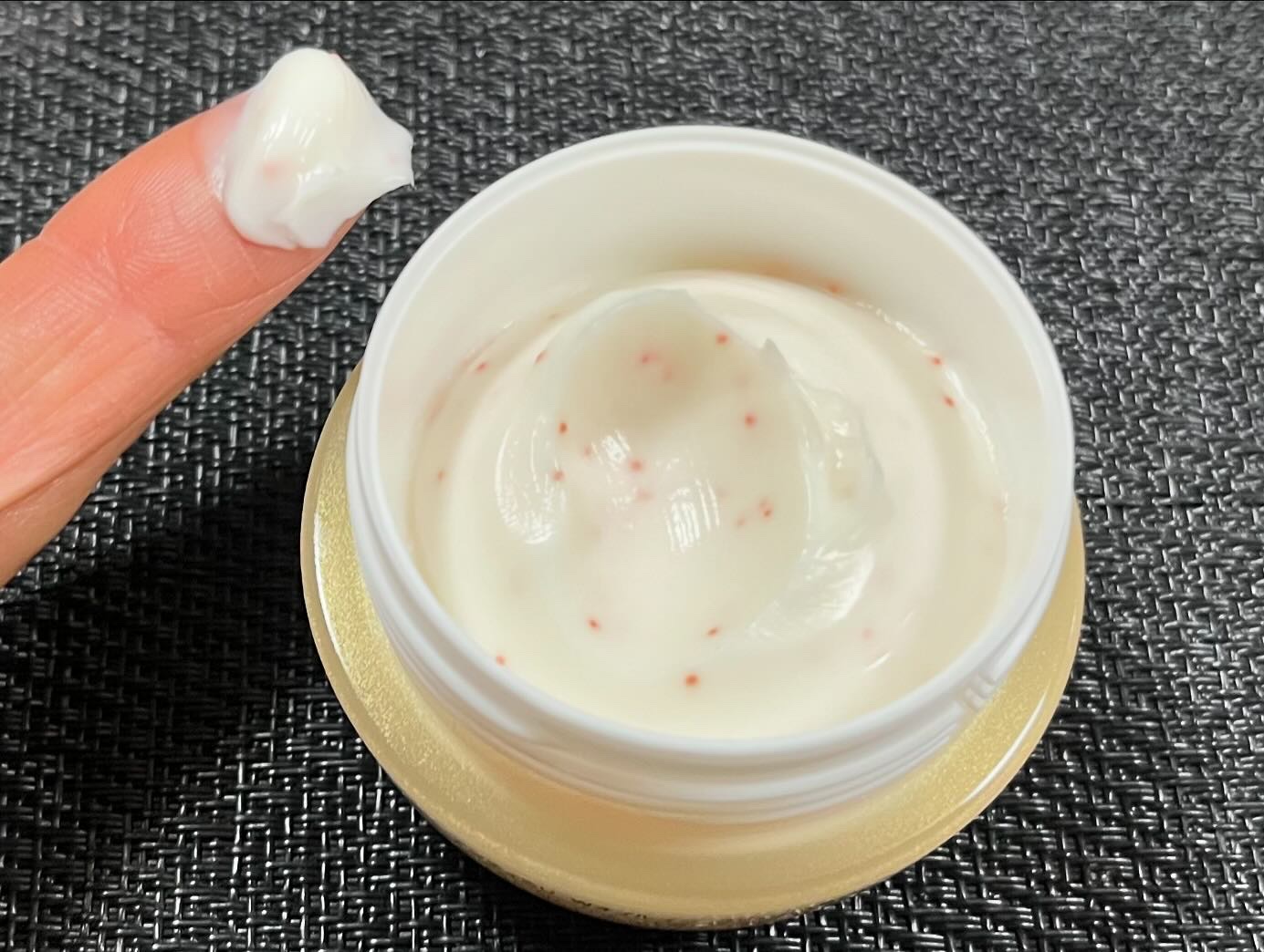 手ごわい乾燥に立ち向かう高保湿クリーム💛 白いクリームにオレンジ色のつぶつぶとしたビタミンオイルカプセルが入っていてます💛 こっくりとしたテクスチャーだけど肌に馴染ませるとスルスルと溶け込むように馴染んでしっとりツヤツヤな肌に♡ 保湿力をしっかり感じるけどべたべたしないところがお気に入り!
