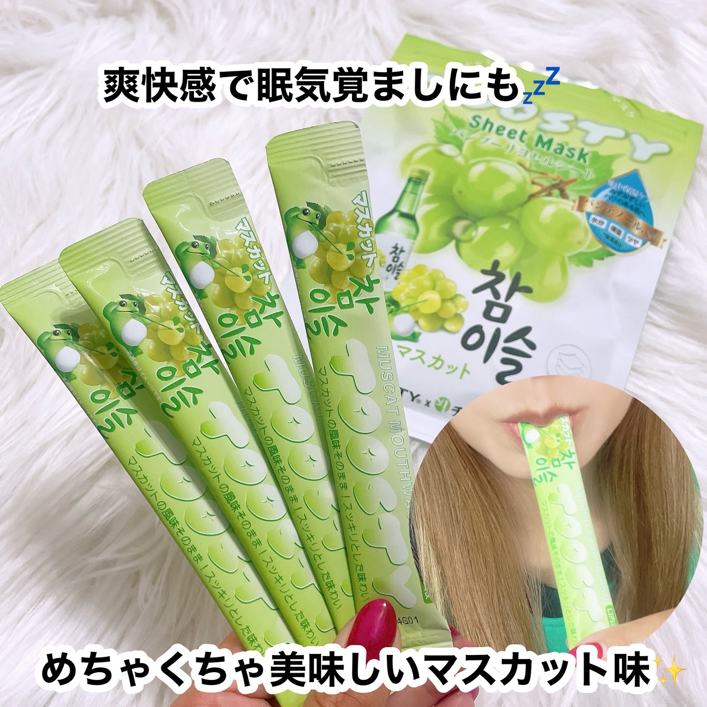 すもものとっても良い香りが広がりました! 本物のチャミスルを飲んでいるかのよう🍶 (アルコール0%です!) ナイアシンアミド (整肌成分) と ビタミン ヒアルロン酸 (保湿成分)が角質層まで浸透してお肌がうるうるつやつやに…! たった10秒で簡単に口腔ケアできました! スッキリとしたミント味で、外出先で歯磨きできないときや、匂いが気になる時などにおすすめ!