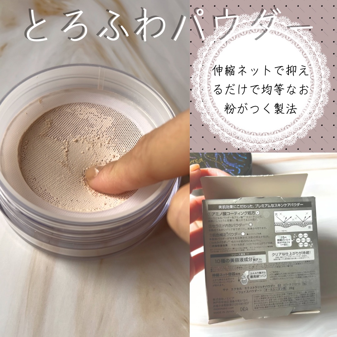 - 【限定発売】 ※10月22日よりエクセル公式オンラインショップ及びAmazonにて先行販売 7色パールでふわツヤ肌 美肌演出効果にこだわった、プレミアムなスキンケアパウダー 1.アミノ酸コーティング処方 ベースとなるパウダーをアミノ酸*1でコーティング。 お肌にしっとりと密着し、上質なうるふわ肌に。 2.セラミド内包パウダー*2 お肌のうるおいバリアをサポートし、乾燥から守ります。 3.肌色補正 ◆パウダー ◆メイクアップ効果 多面体パウダーが光を乱反射させ、お肌の明るい印象UPを演出。 ○シルクパウダー*3:毛穴やお肌の凹凸をカバー。 ○皮脂吸着効果:テカリを防ぎ、つけたての仕上がりが持続。 7色の微細パールで発光するようなツヤ肌に ピンク パープル ブルー グリーン オレンジ ゴールド シルバー シリーズ最多*4 10種の美容液成分*5贅沢in(すべて保湿) クリアな仕上がりが持続! 皮脂に触れてもくすみにくいパウダーを配合。 時間が経っても透明感のある美しいお肌をキープ。 伸縮ネット容器採用 上から押さえるだけでパフに均一にパウダーが取れます。 ふんわり贅沢な最高級*6パフ オールシーズン用 <01 ピーチベージュ> セミマットなうるふわ肌 美肌演出効果にこだわった、プレミアムなスキンケアパウダー <02 ピーチグロウ> 7色パールでふわツヤ肌 美肌演出効果にこだわった、プレミアムなスキンケアパウダー *1 ジラウロイルグルタミン酸リシンNa(保湿) *2 コメヌカスフィンゴ糖脂質、コメヌカ油、シクロデキストリン(すべて保湿) *3 シルク *4 サナ エクセル エクストラリッチパウダーシリーズにおいて *5 リピジュア(ポリクオタニウム-51)、ビタミンC誘導体(リン酸アスコルビルMg)、ビタミンA誘導体(パルミチン酸レチノール)、ビタミンB(ピリドキシンHCl)、ビタミンE誘導体(トコフェリルリン酸Na)、パンテノール、エクトイン、スクワラン、アルガンオイル(アルガニアスピノサ核油)、ホホバ種子油 *6エクセルブランド内において