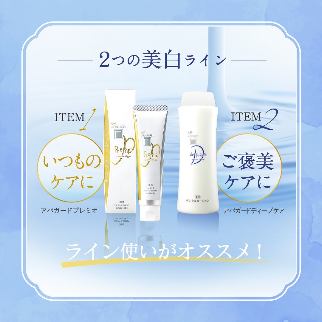 - シャンプーの後にトリートメント、洗顔の後に美容液。髪や肌のお手入れと同じように、歯もさらなるケアをしませんか?いつもの歯みがき習慣に加えて丁寧にケアしたいときに、デンタルローション(液体歯みがき)で仕上げケア。口に含んで軽くブラッシングして少量の水ですすいで下さい。むし歯予防成分「薬用ハイドロキシアパタイト」配合のデンタルローションは、とろりとした白い濃密な液体が歯と歯の間に広がります。アパガードディープケアで艶めく白い歯に。